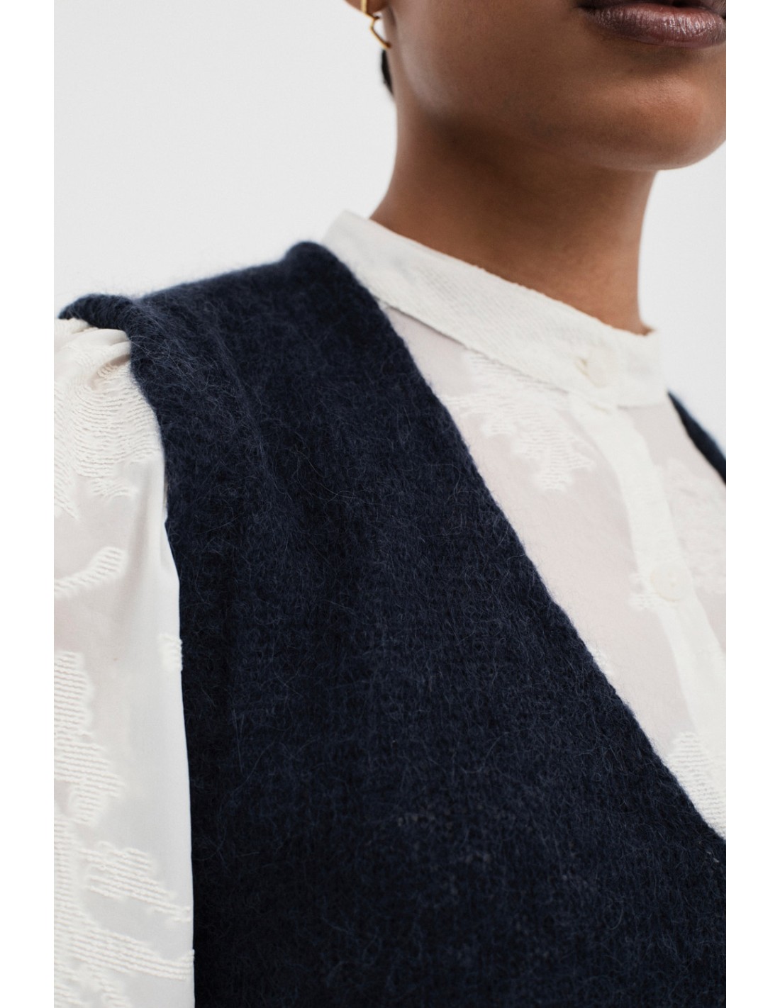 Chaleco de punto liso con cuello pico. Es una prenda de tricot integral, versátil y elegante para completar cualquier look.