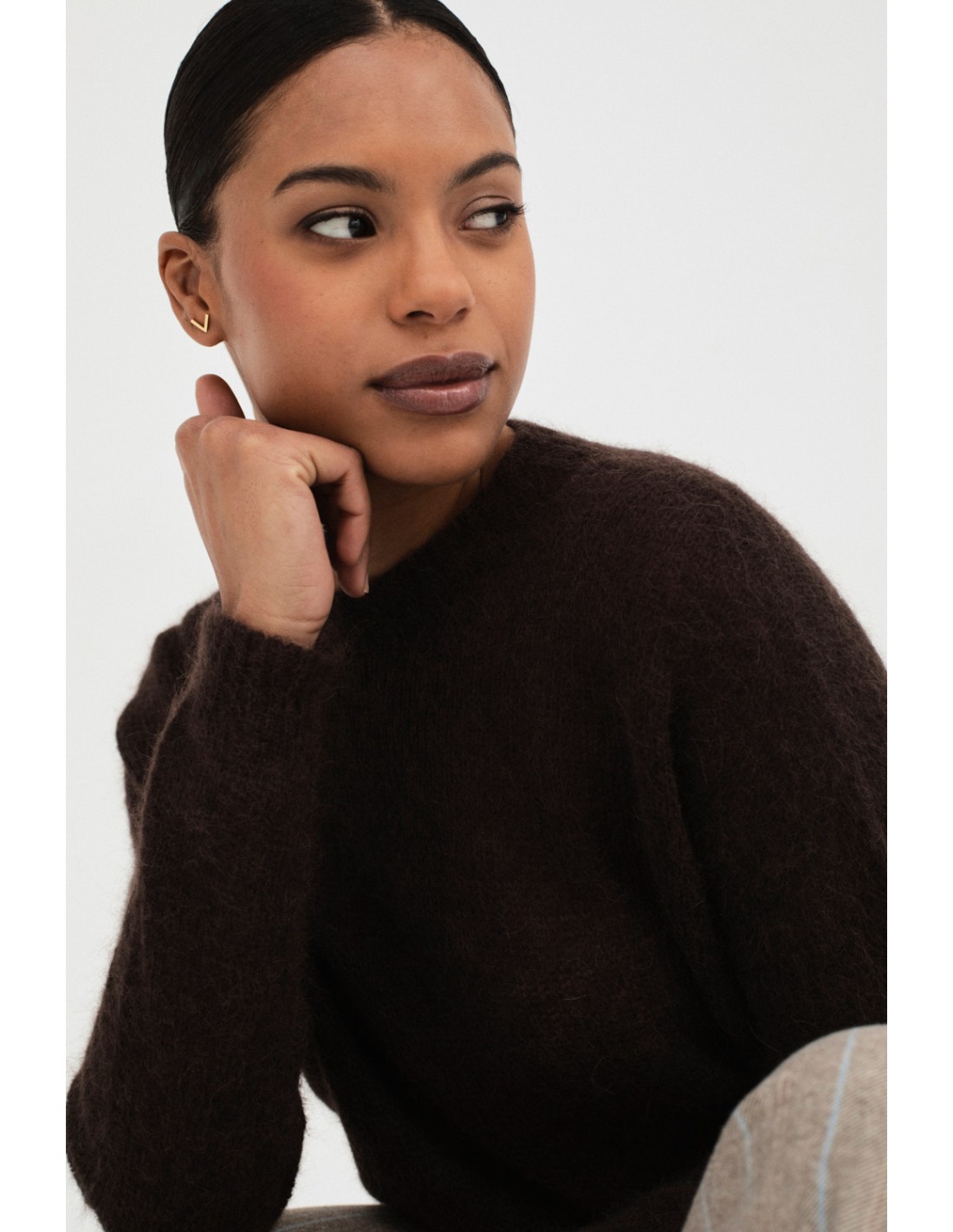 Un jersey de punto liso con cuello redondo y manga larga. Es de tricot integral y presenta acabados en canalé, bajo redondeado y un diseño ligeramente más corto en el delantero.
