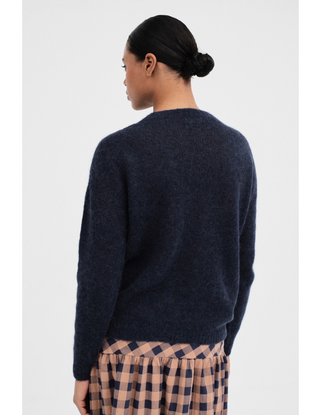 Un jersey de punto liso con cuello redondo y manga larga. Es de tricot integral y presenta acabados en canalé, bajo redondeado y un diseño ligeramente más corto en el delantero.