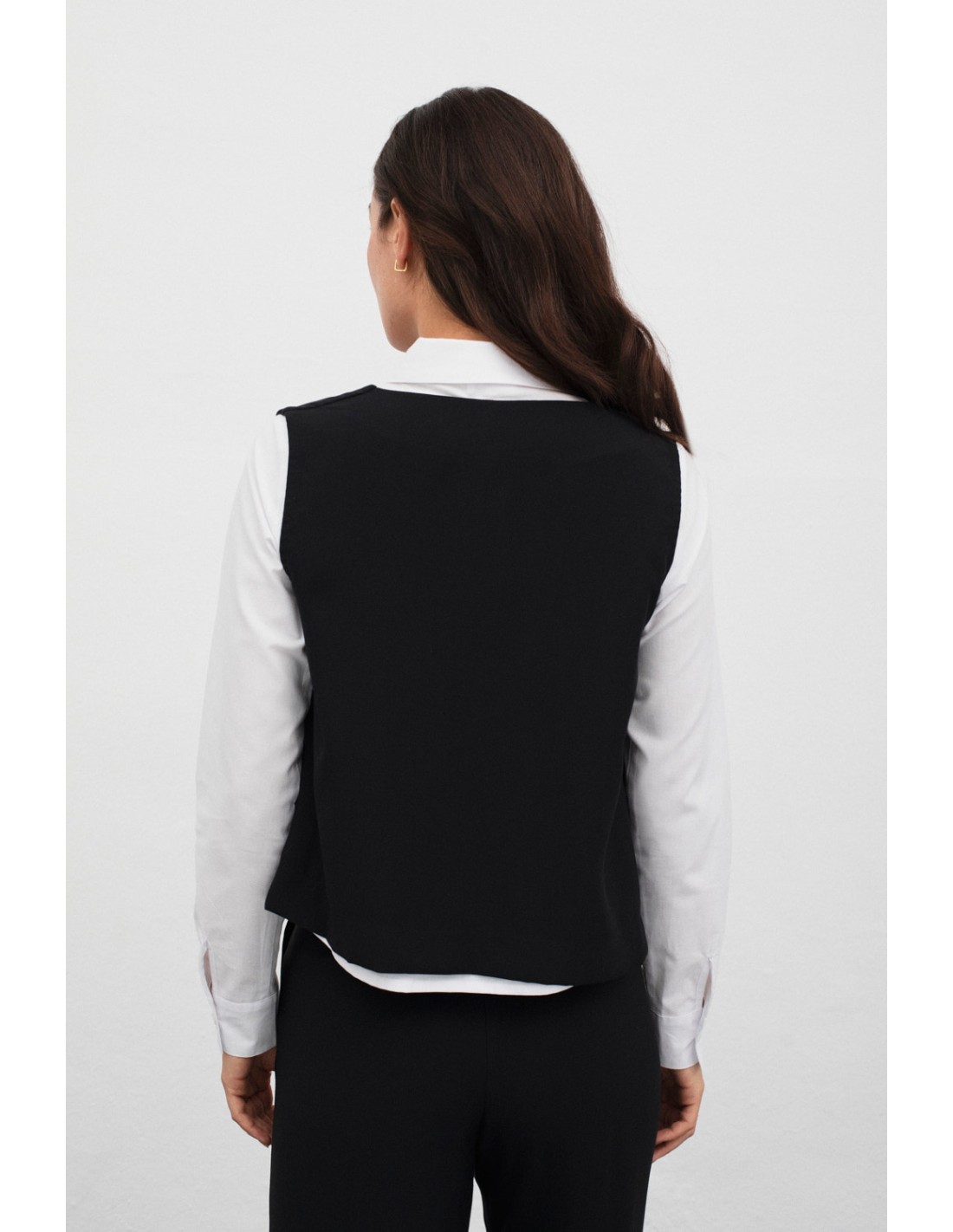 Chaleco corto con cierre lateral de botón, escote en pico y falso bolsillo en el costado derecho. El lado derecho se superpone sobre el izquierdo, y es ligeramente más largo. Combina con el pantalón Billwerder para un total look.