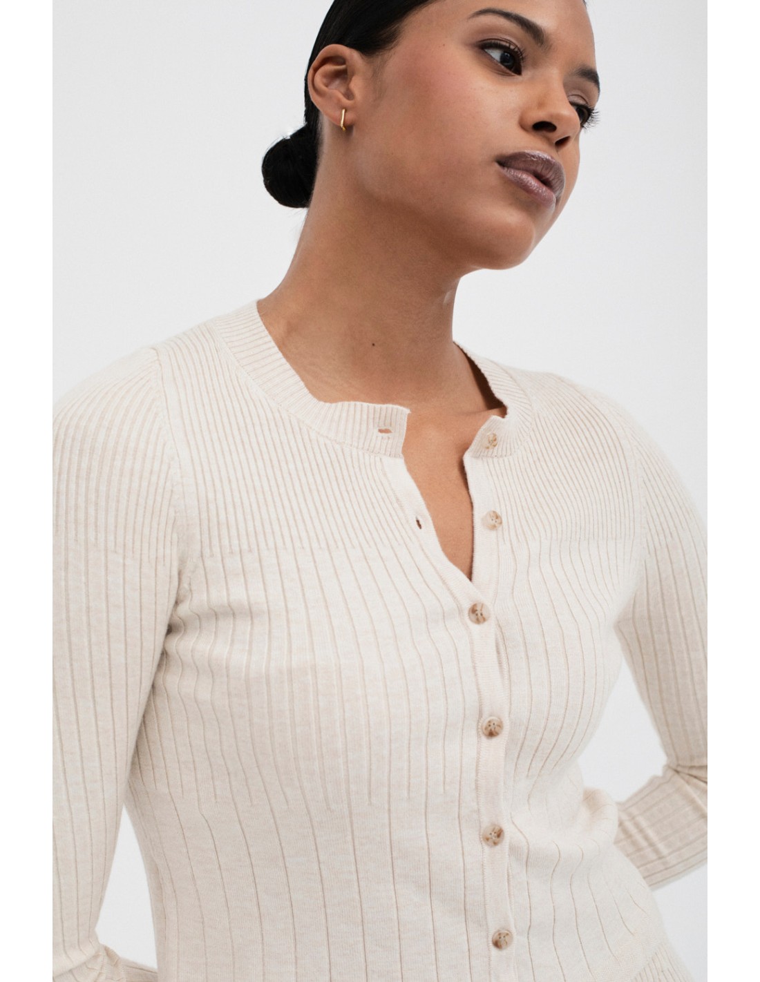 Cárdigan de manga larga y corte recto, con un diseño único que combina tres tipos diferentes de canalé en el cuerpo y dos en las mangas. Tiene un cuello redondo y una abertura con botones en frente. Los puños cuentan con un detalle de tres botones. Combina a la perfección con el top Seef, para un diseño dos piezas.