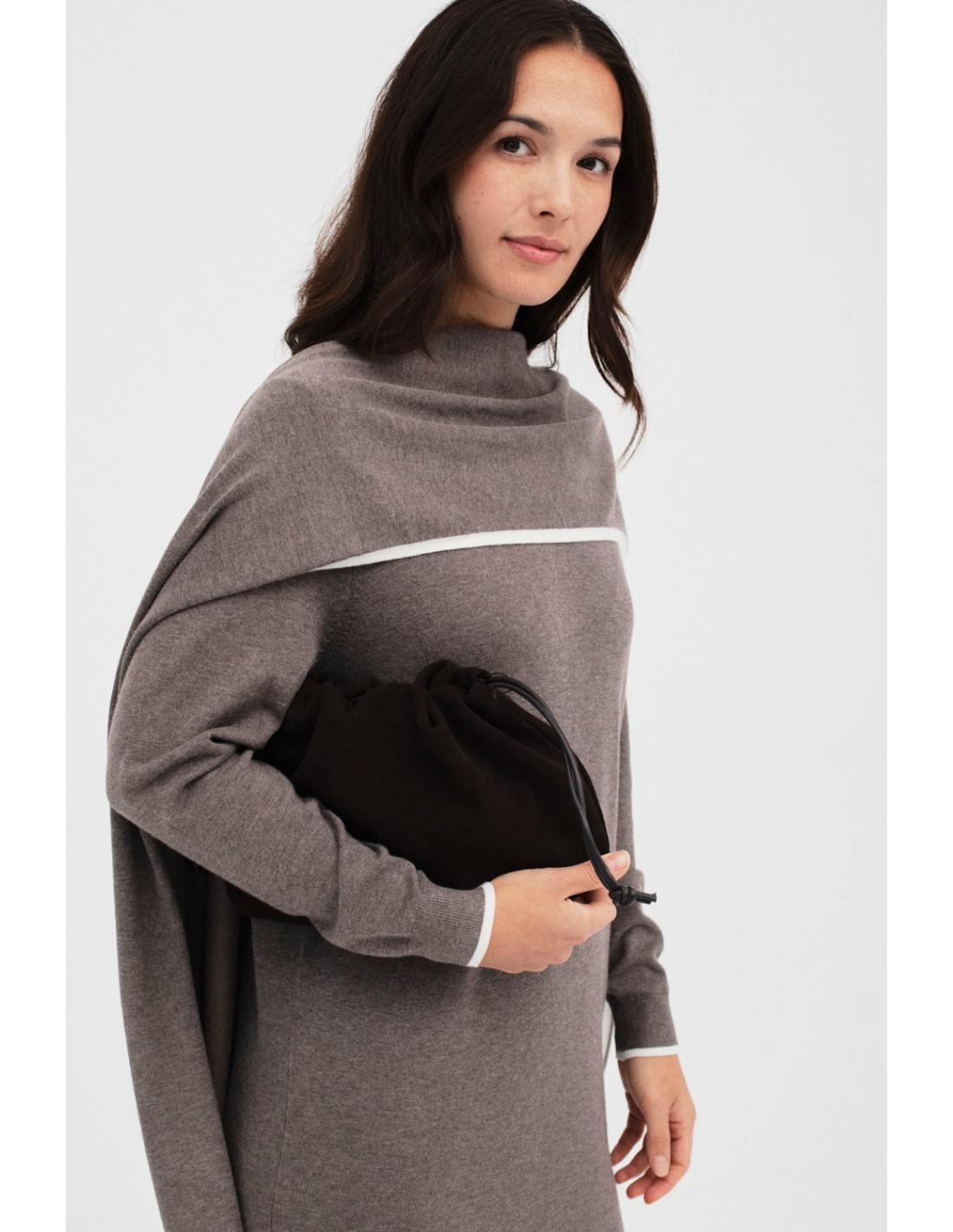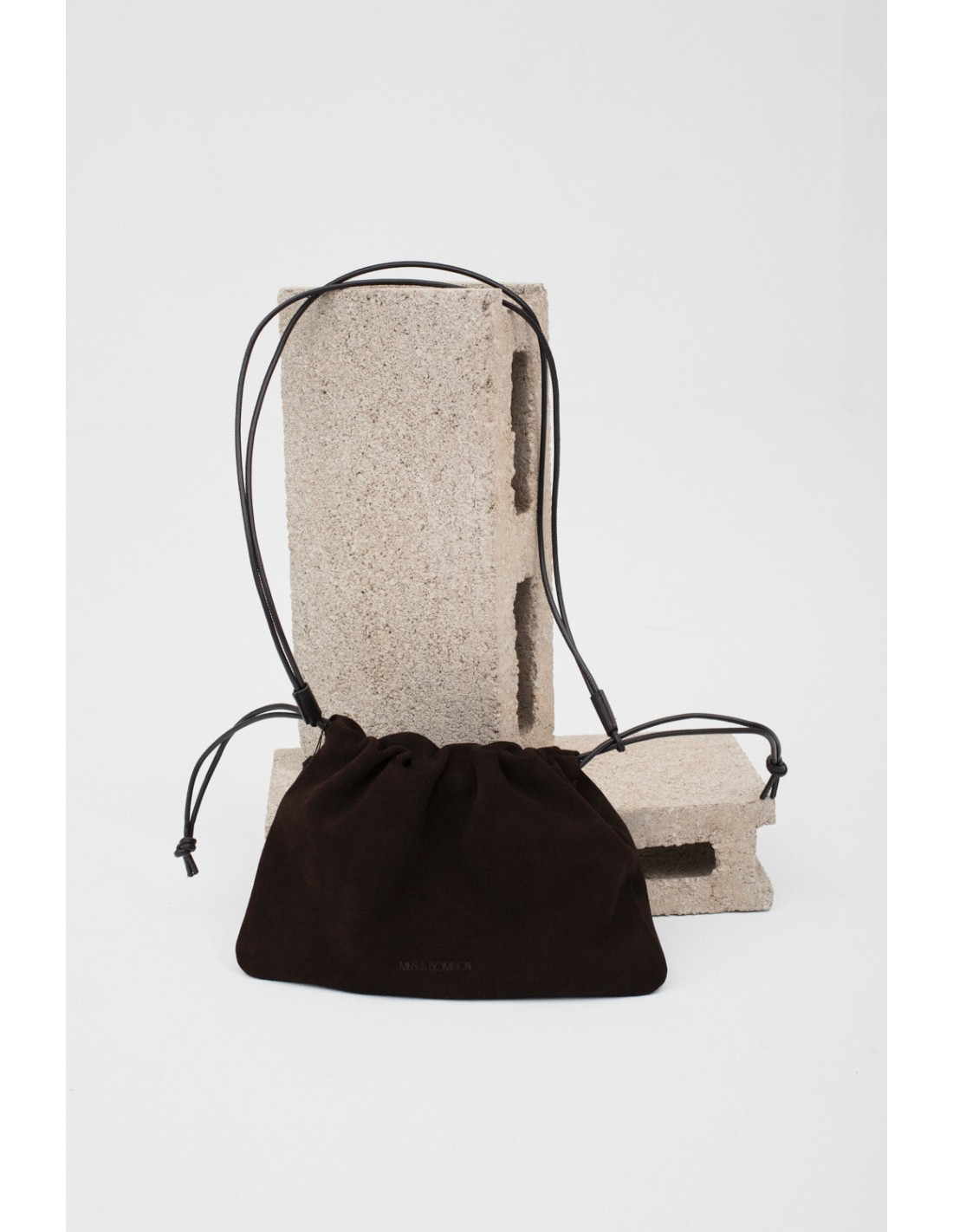 Bolso fruncido cruzado con asa ajustable y cierre con cordón. Interior con un bolsillo con vivo de piel y otro bolsillo con cremallera. El logo de Mus&Bombon está grabado en el exterior.