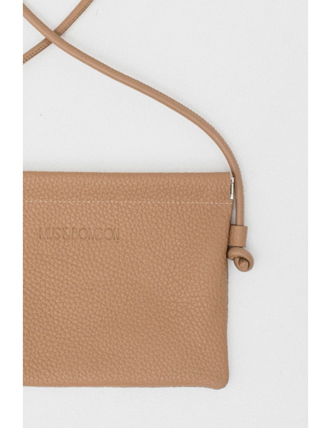 Bolso mini de piel con asa larga regulable y cierre magnético. Tiene el logo de Mus&Bombon grabado en el exterior. El bolso perfecto para llevar lo indespensable para tu día a día.