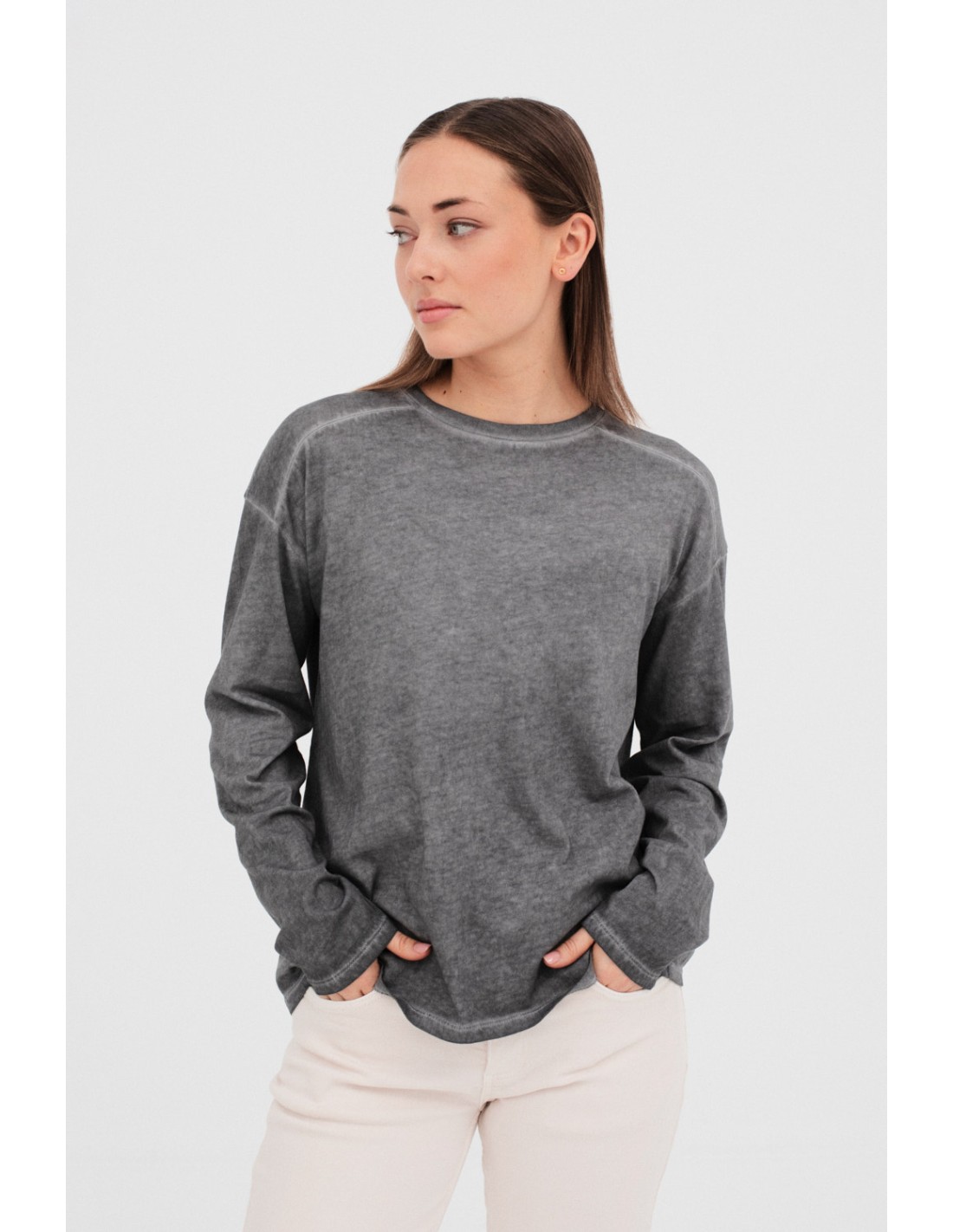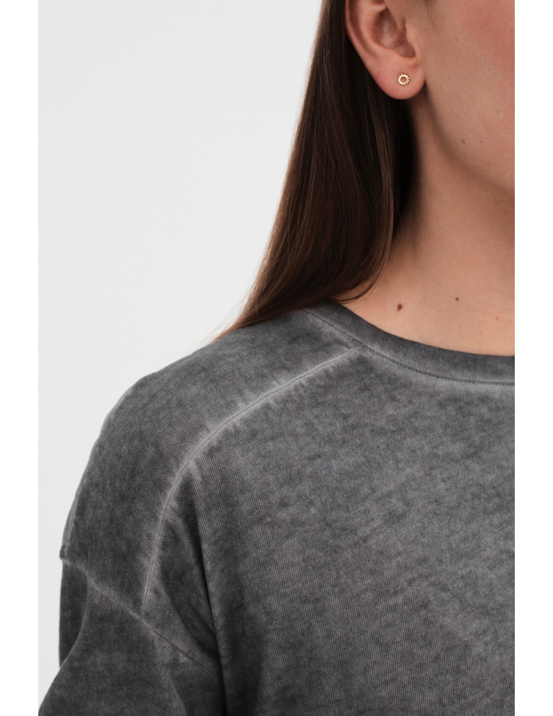 Meir es una camiseta de tinte vegetal con cuello redondo. Tiene los hombros adelantados, mangas rectas y un corte relajado, perfecta para un look cómodo y casual.