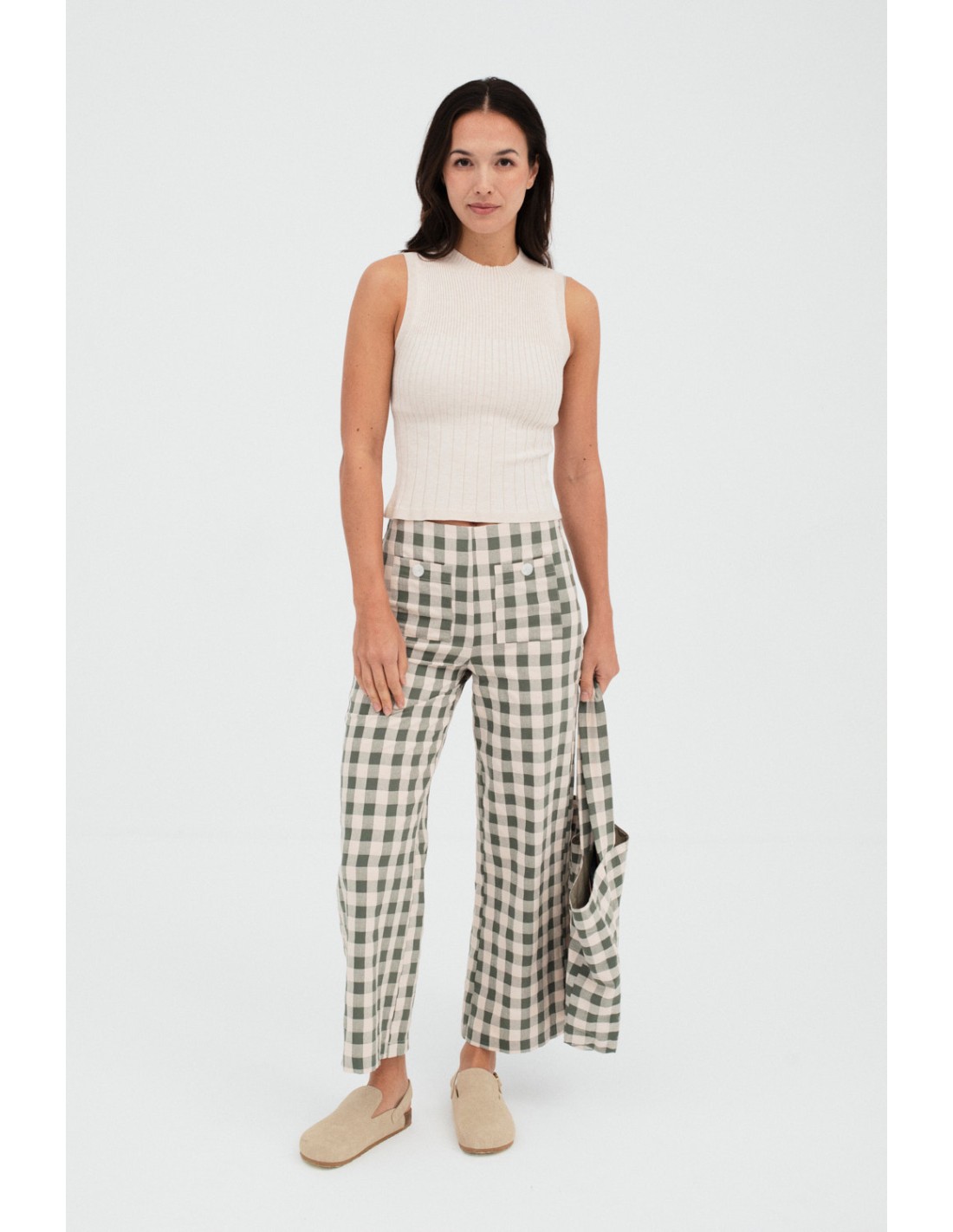 Top de punto sin mangas, con un diseño que combina tres tipos diferentes de canalé en el cuerpo. Tiene un elegante cuello alto en canalé 2x2 y detalles de punto fantasía en las sisas y el bajo. Combina a la perfección con el cárdigan Sufouh y la falda Safa.