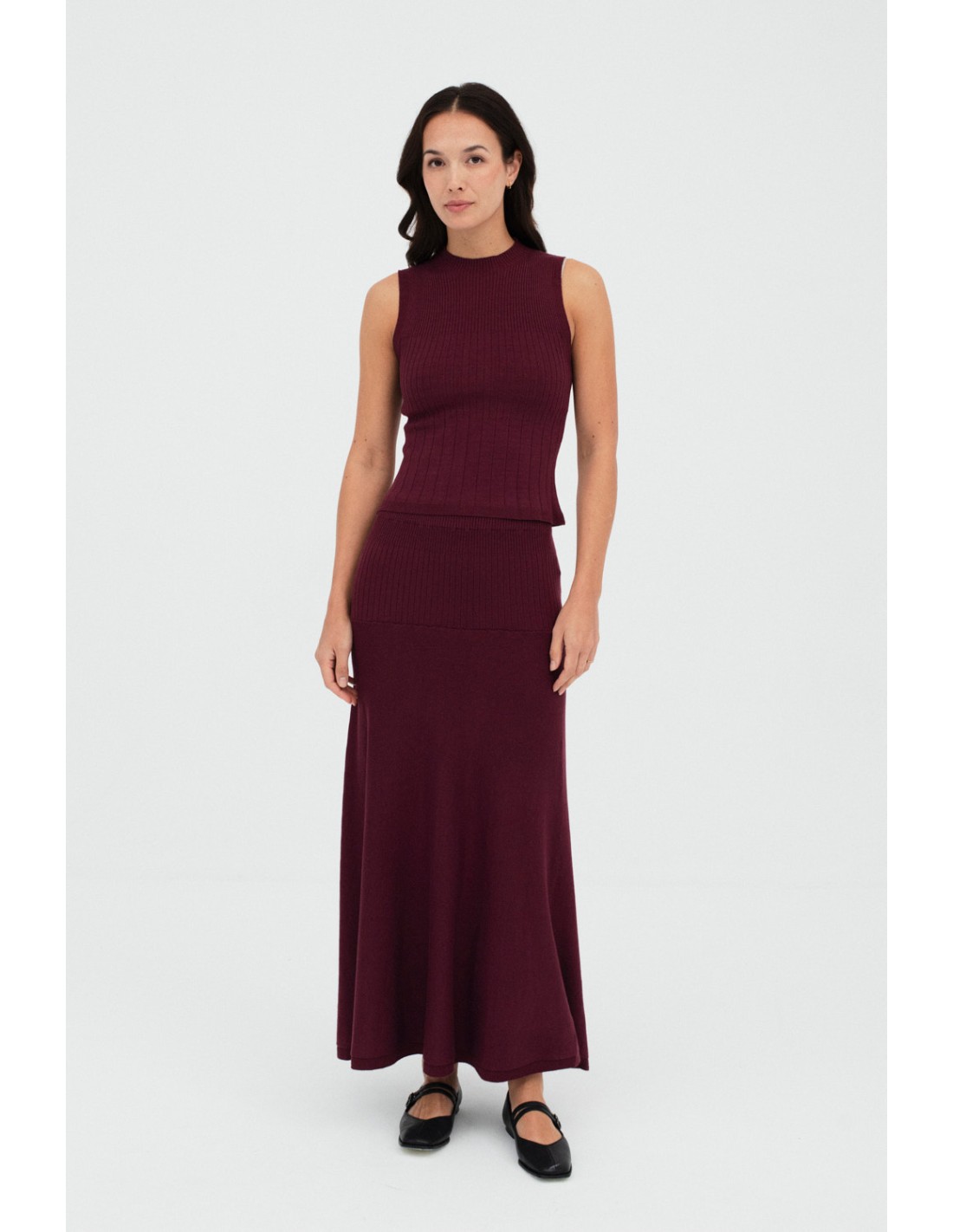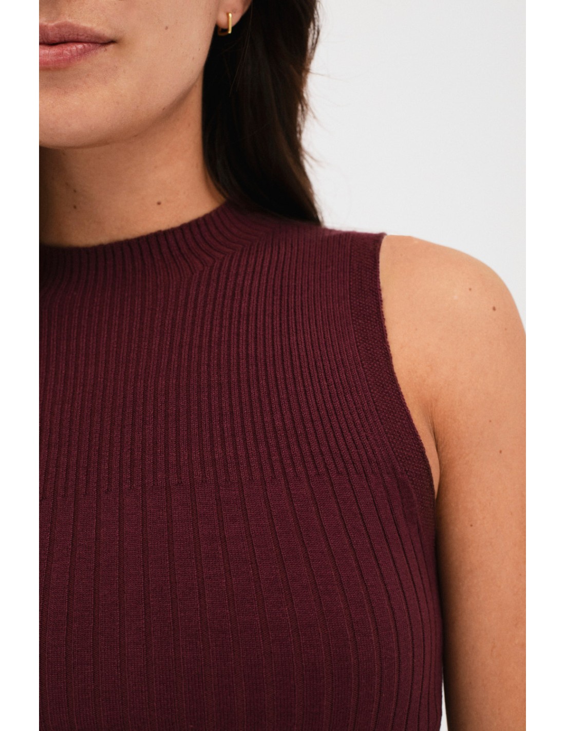Top de punto sin mangas, con un diseño que combina tres tipos diferentes de canalé en el cuerpo. Tiene un elegante cuello alto en canalé 2x2 y detalles de punto fantasía en las sisas y el bajo. Combina a la perfección con el cárdigan Sufouh y la falda Safa.