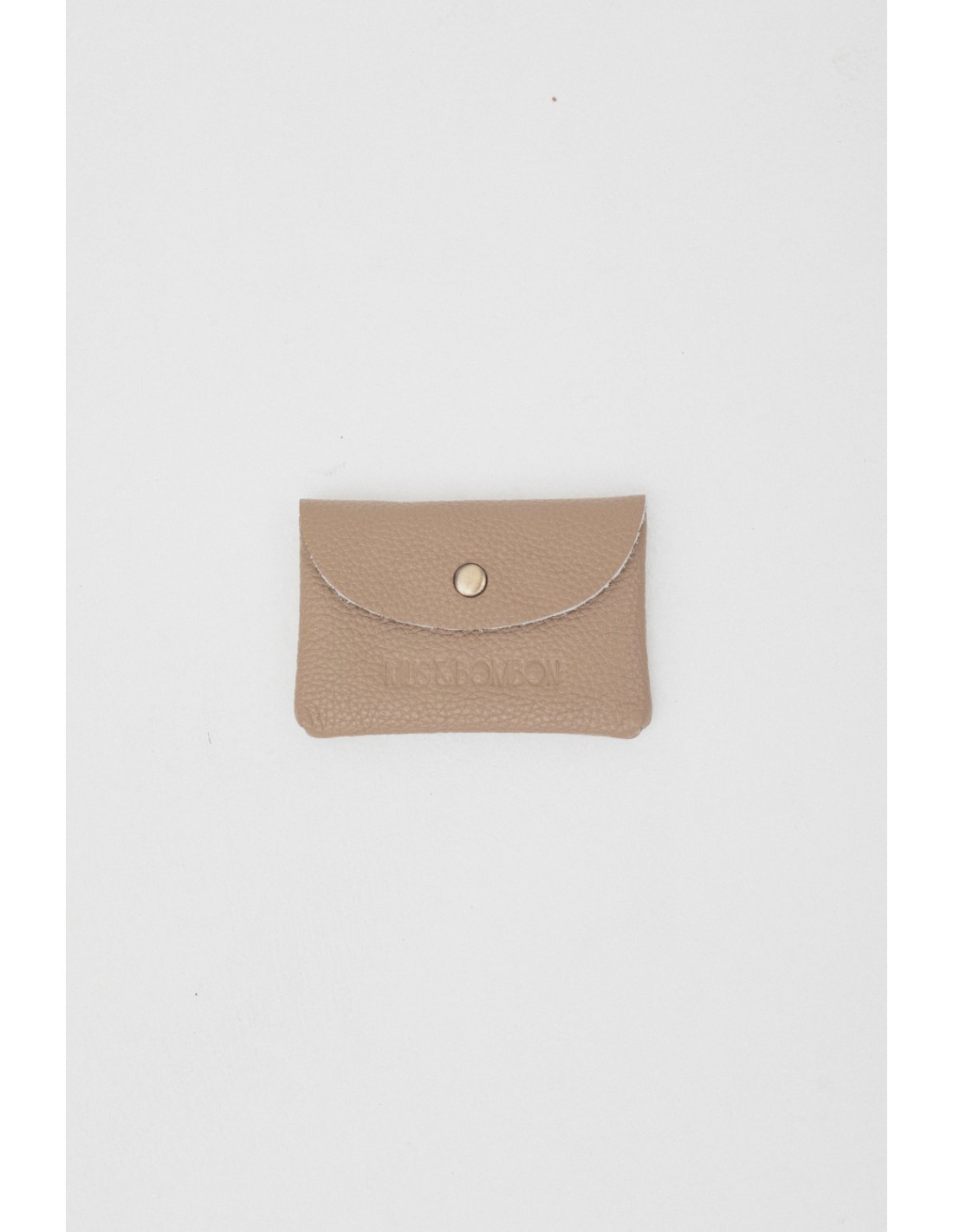 Monedero pequeño de piel con cierre de botón a presión en el centro. Tiene el logo de Mus&Bombon grabado en el exterior.