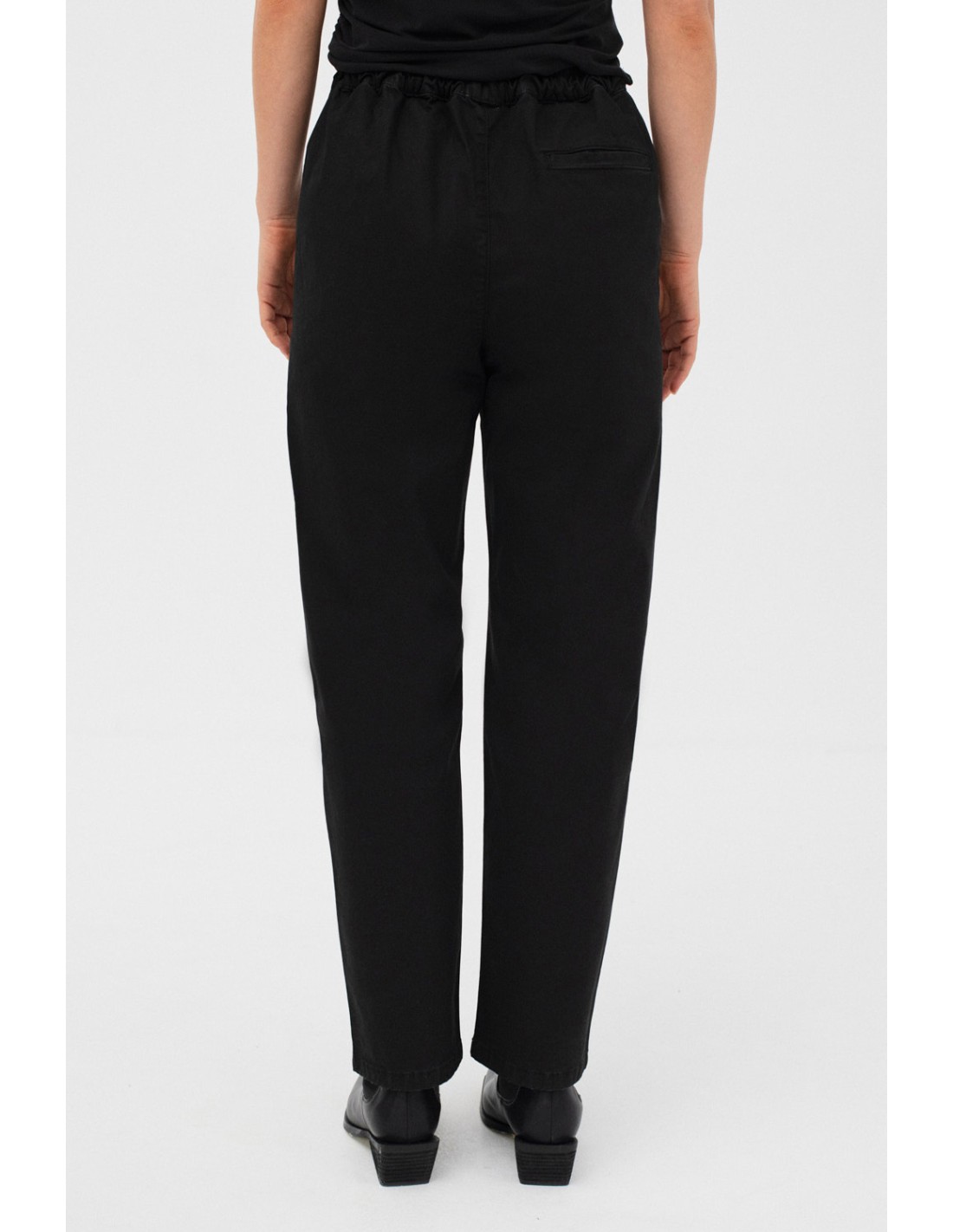 Pantalón chino con cinturilla plana en el frente y banda elástica plana en espalda. Bolsillos diagonales en la parte delantera y bolsillos traseros con cinta al bies.