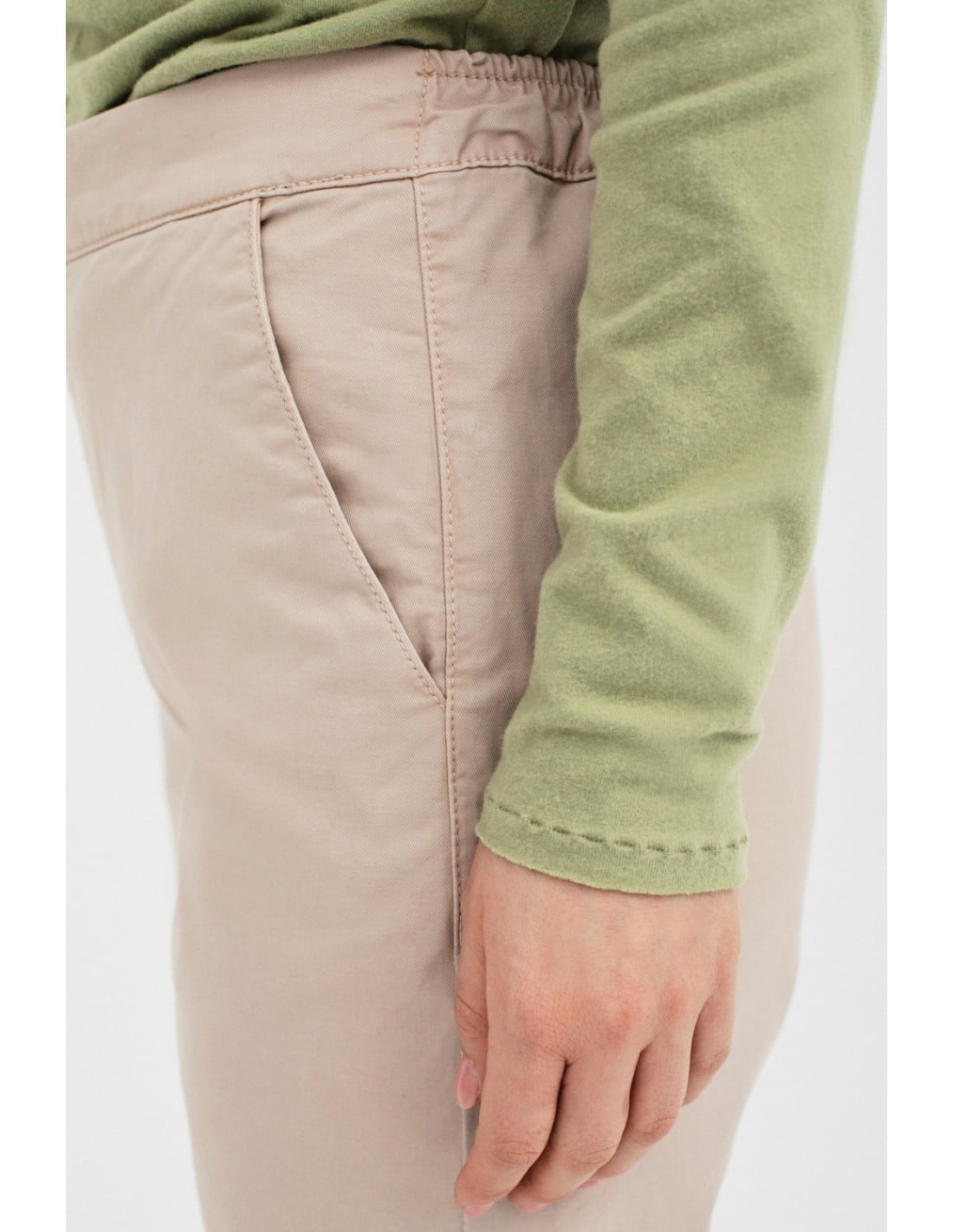 Pantalón chino con cinturilla plana en el frente y banda elástica plana en espalda. Bolsillos diagonales en la parte delantera y bolsillos traseros con cinta al bies.
