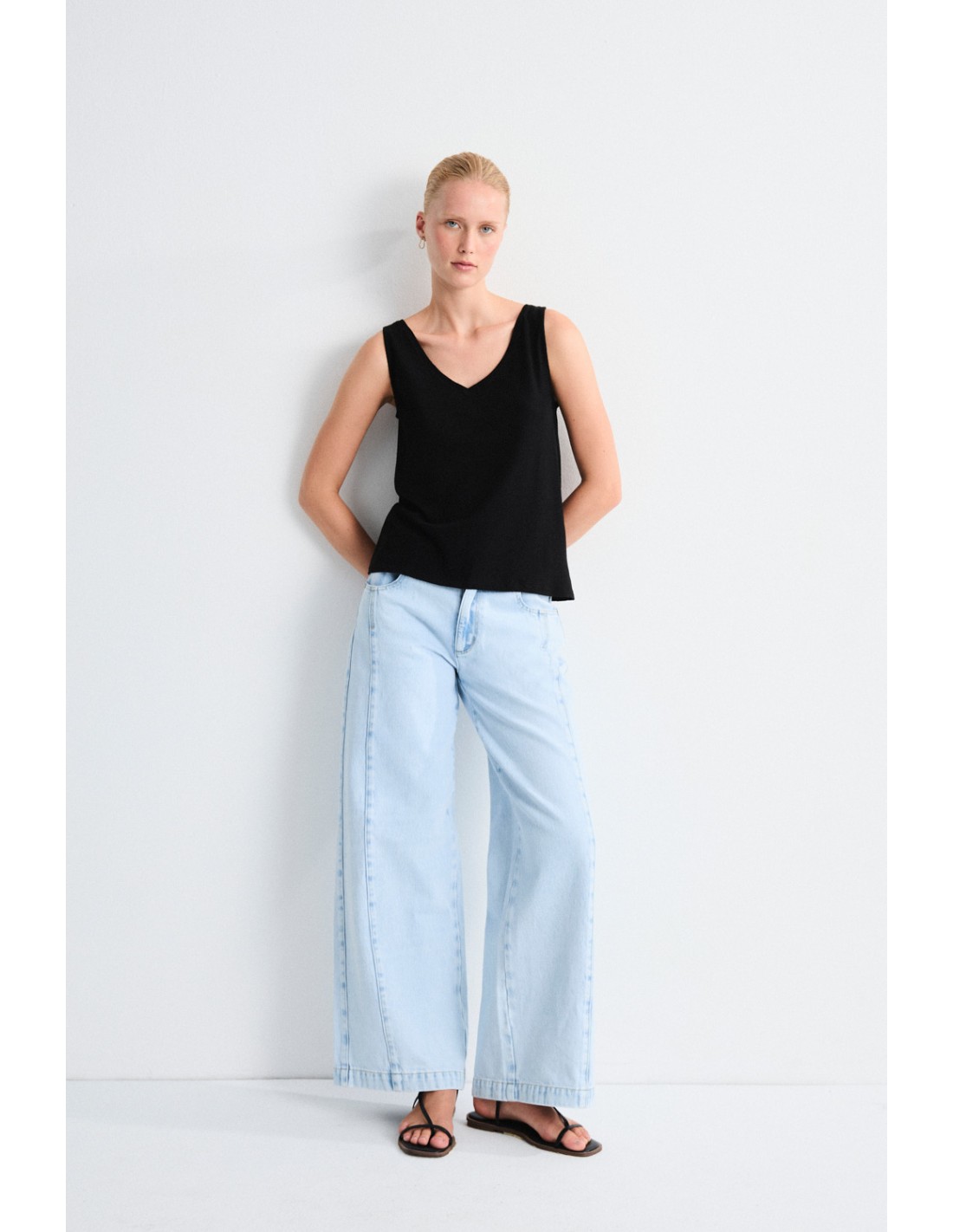 Pantalón largo denim de tiro bajo con cierre mediante botón metálico, detalle de costura central y pierna ancha. Una silueta actual con aire setentero.