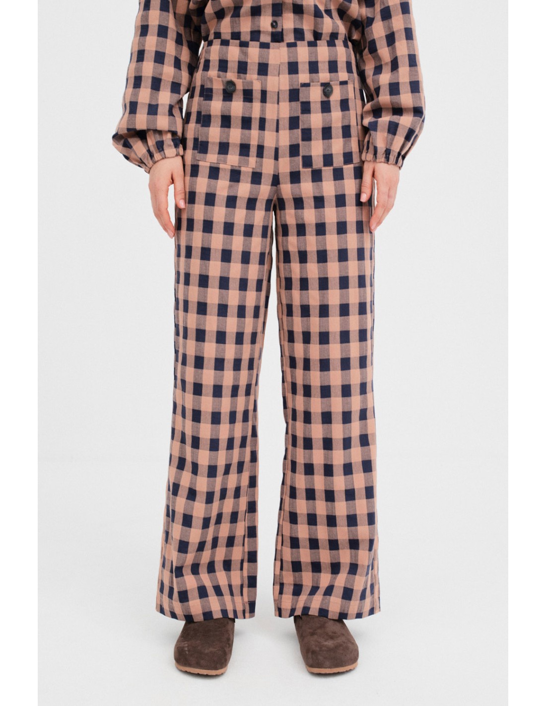 Pantalón culotte de vichy con goma plana en la espalda, cremallera invisible en el lateral y bolsillos frontales con botón. Combina con la blusa Marlene y el bolso Whitehall.