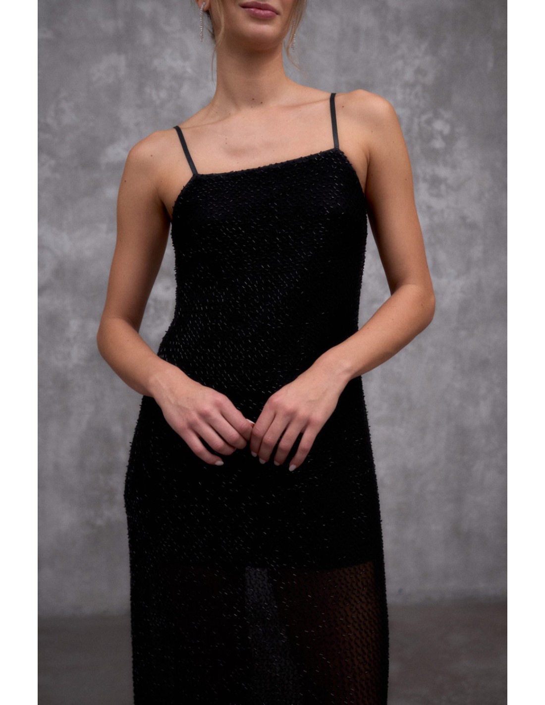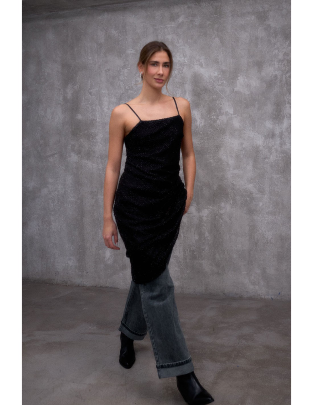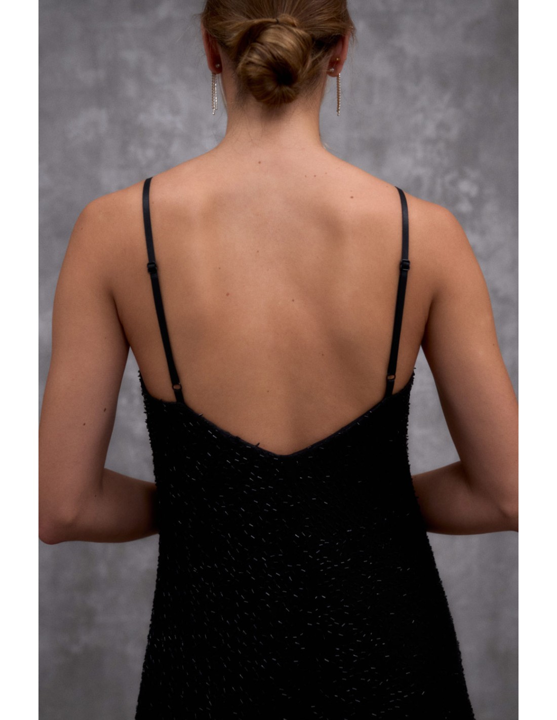 Vestido confeccionado en un luminoso tejido de lentejuelas con sutiles transparencias. Presenta tirantes finos con regulador para un ajuste preciso y un forro interior corto que garantiza comodidad sin restar fluidez. Una pieza radiante, ideal para elevar cualquier ocasión especial.