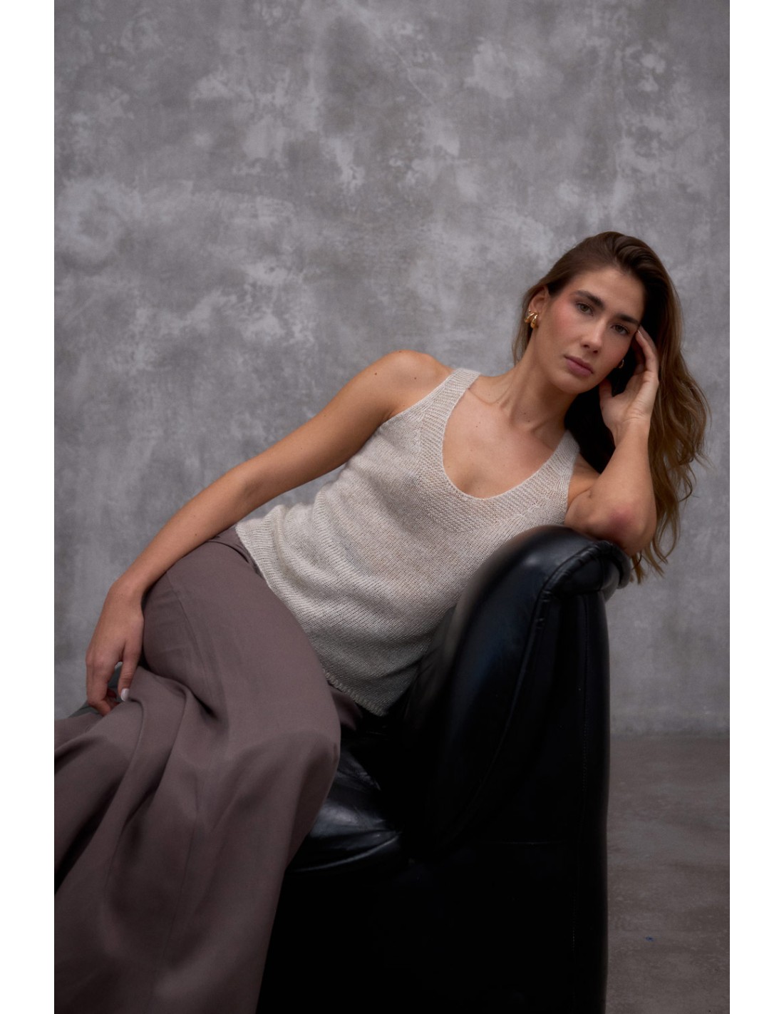 Top de punto metalizado con cuello redondo de canalé. Una prenda versátil con un acabado refinado que eleva cualquier conjunto. Combina con el jersey Stone o la capa Trine para un look elegante.
