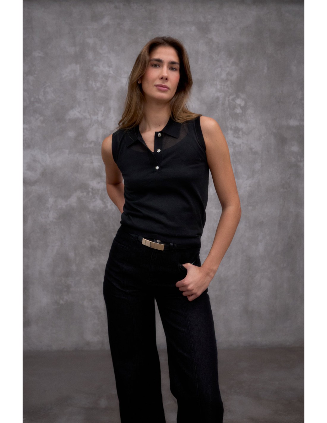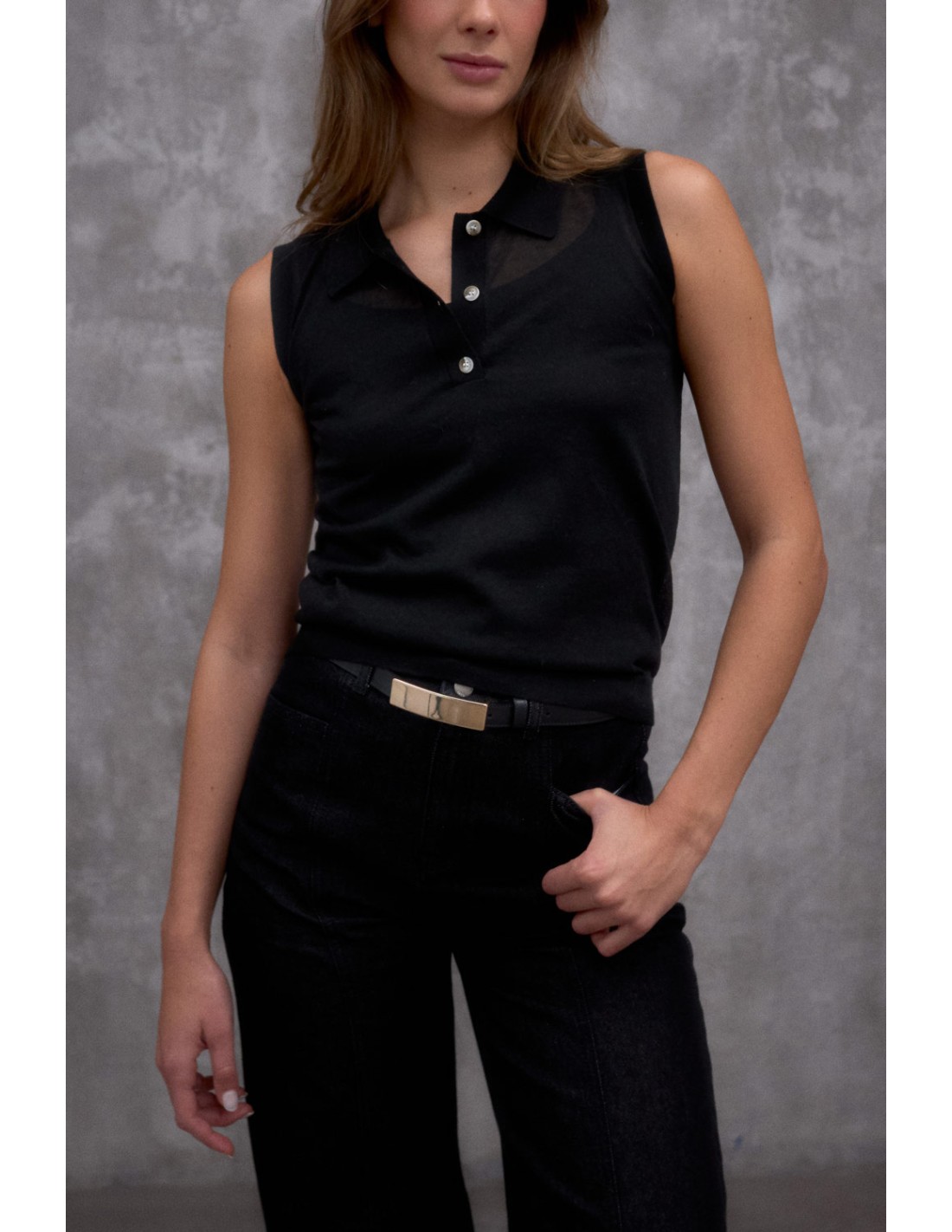 Chaleco tipo polo de punto con cuello de camisa y tapeta de botones, con acabados de canalé en las sisas y en el bajo que aportan un toque pulido y estructurado. Una pieza versátil que combina con facilidad y eleva cualquier conjunto.
