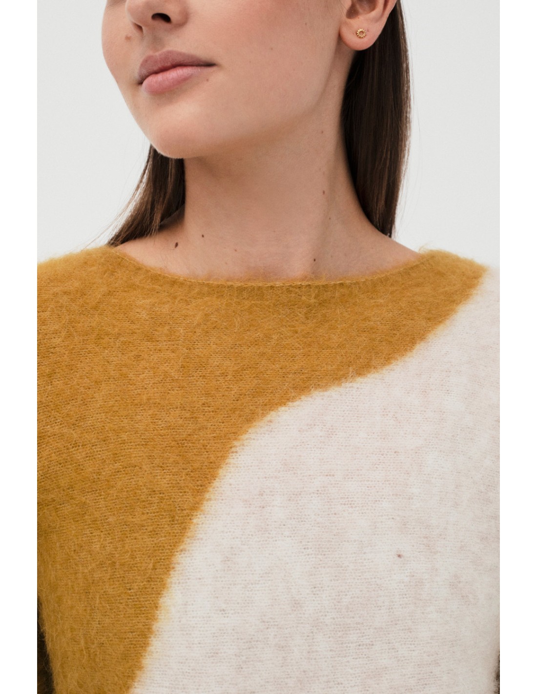 Jersey de manga larga japonesa sin costura. Cuenta con complemento cuello alto añadido. Confeccionado en intarsia bicolor dándole un toque moderno y elegante.