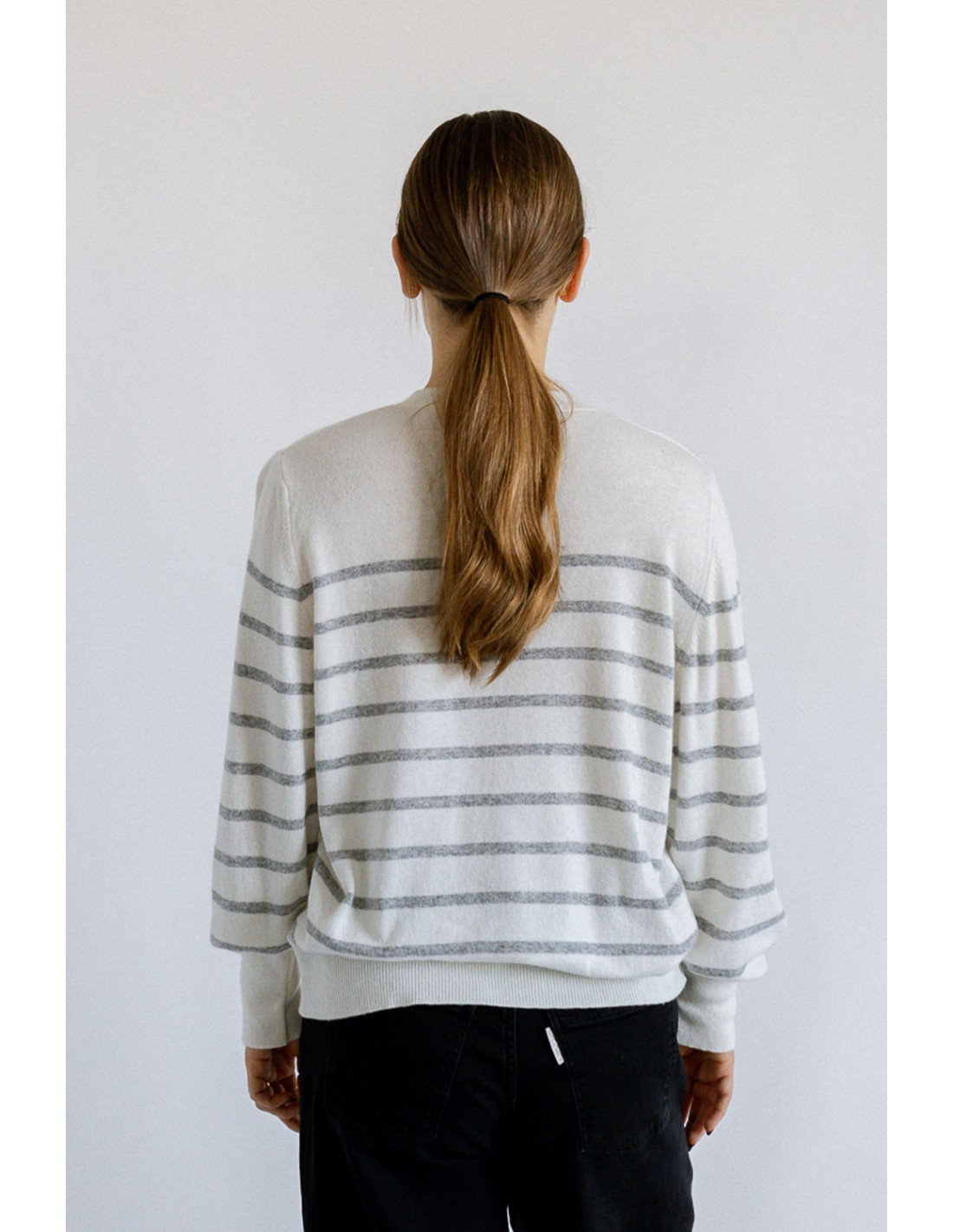 Jersey de manga larga con cuello redondo y tapeta de canalé con botones; puños y bajo con canalé 2x1. Cuerpo con punto simple y rayas a contraste; mangas montadas.