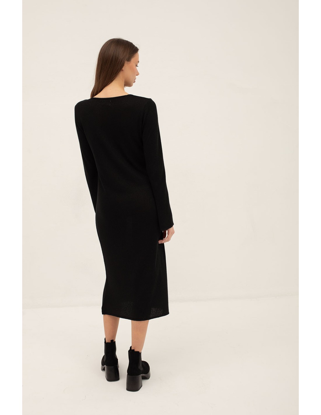 El vestido Tietar es una prenda tricot de lurex de longitud larga, que presenta una abertura lateral y un escote con detalle en forma de lágrima.