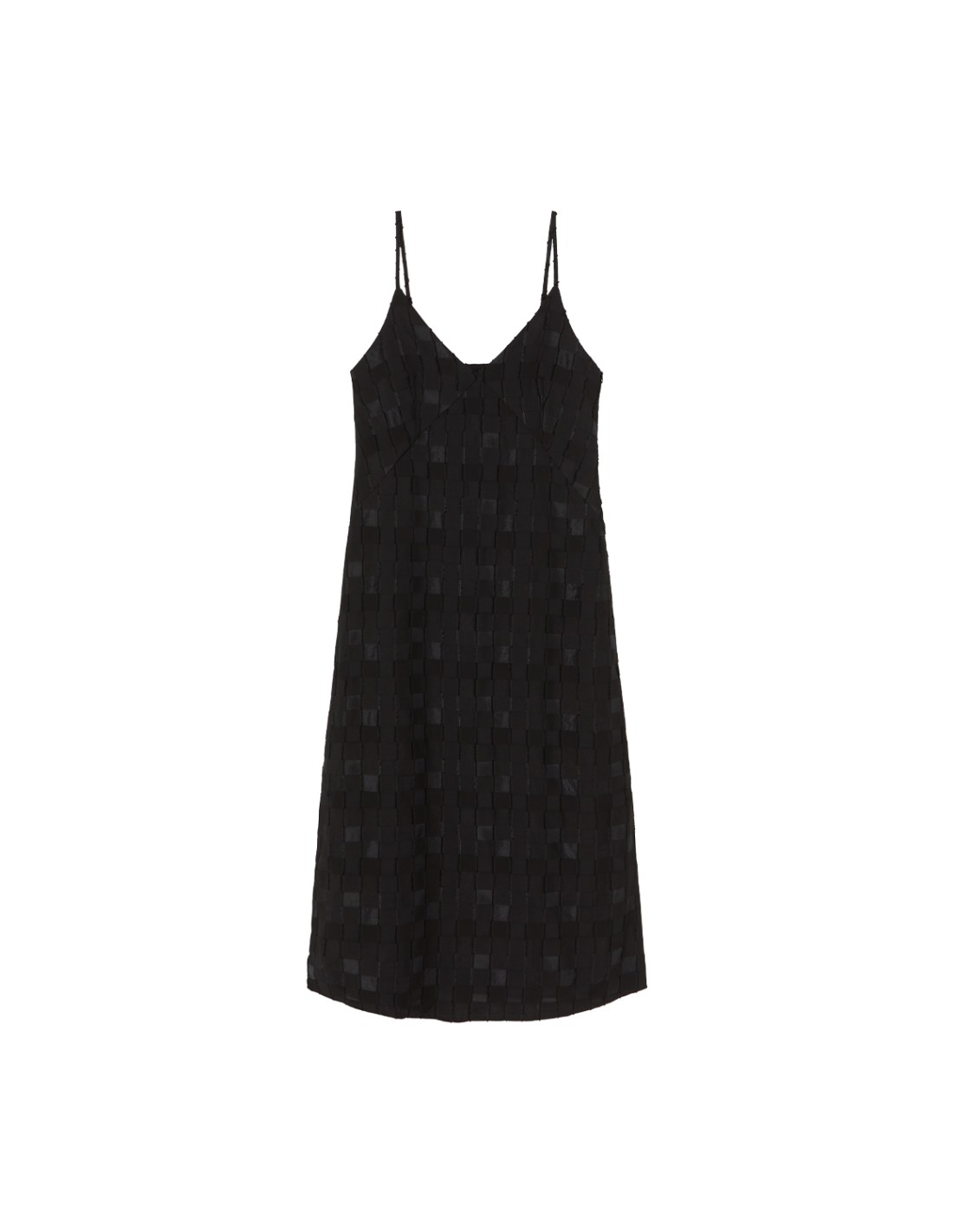 Un vestido de tejido fantasía de cuadros que respira estilo. Cuenta con tirantes finos, escote en pico al frente, espalda recta y discretas aberturas laterales, que combinan frescura y sofisticación.