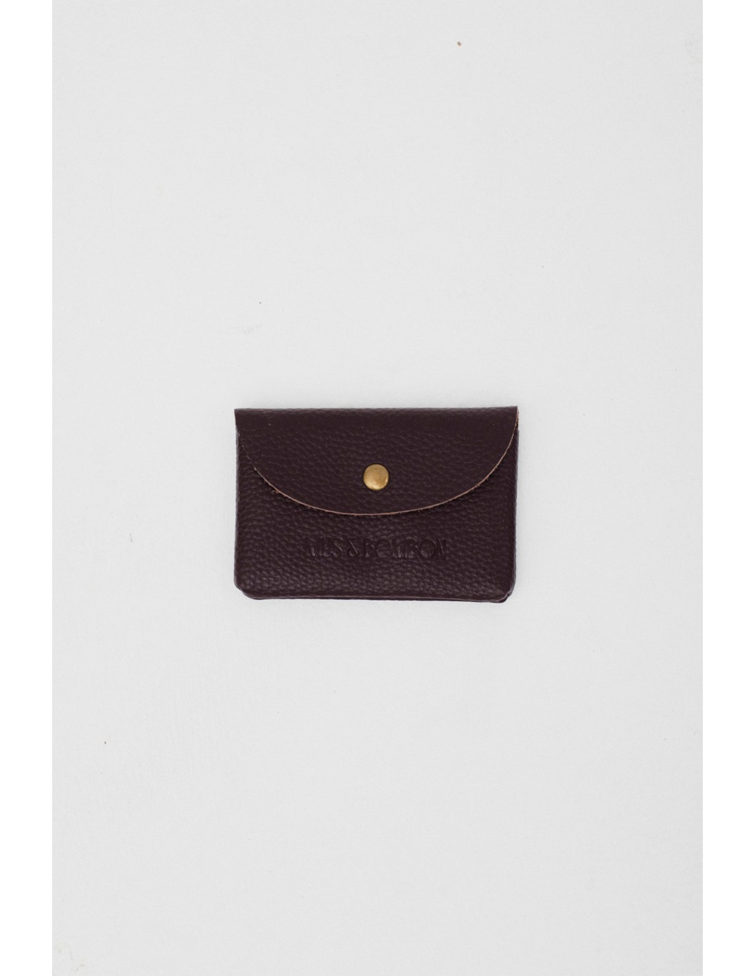 Petit porte-monnaie en cuir avec fermeture à bouton-pression au centre. Il est gravé du logo Mus&Bombon à l'extérieur.