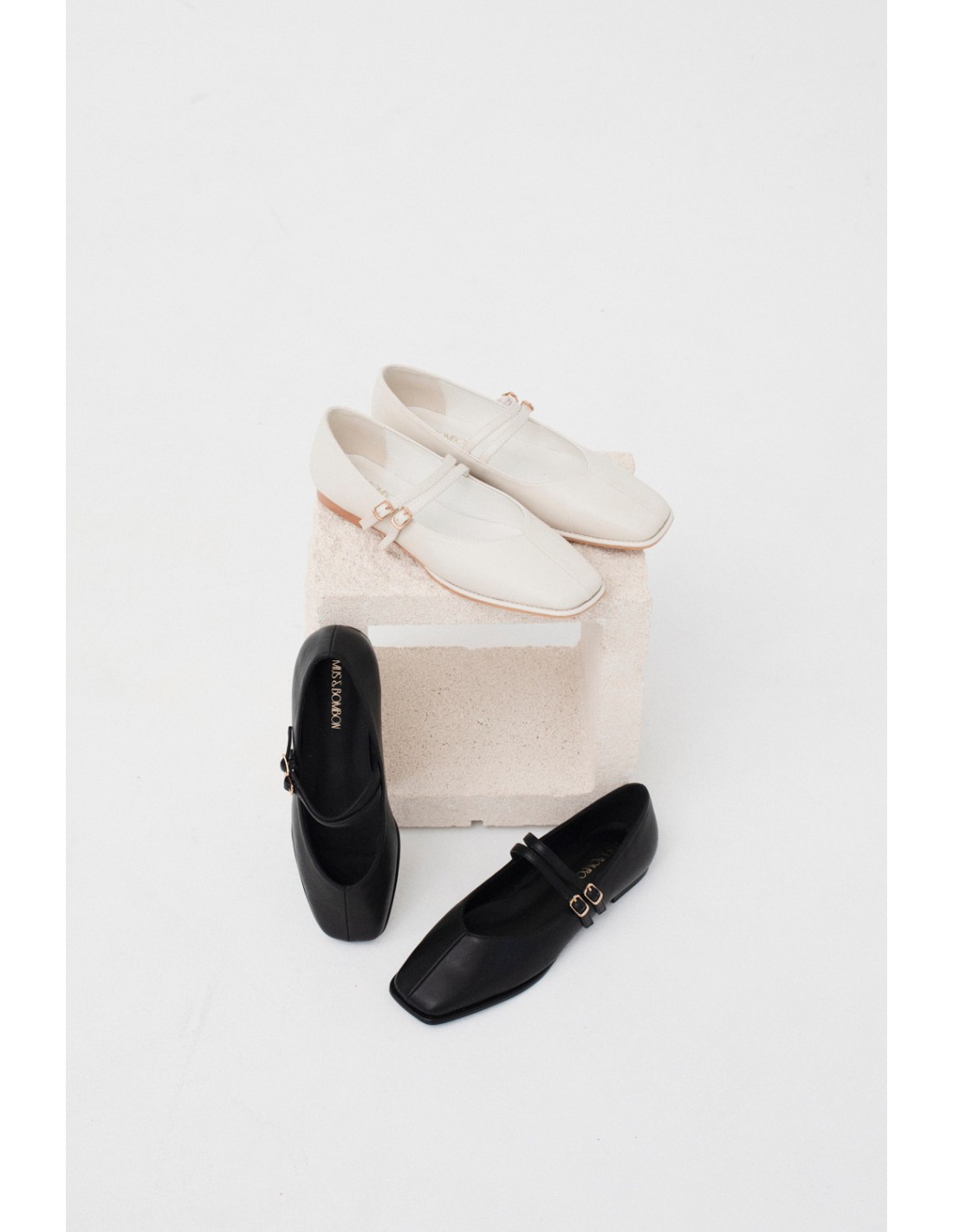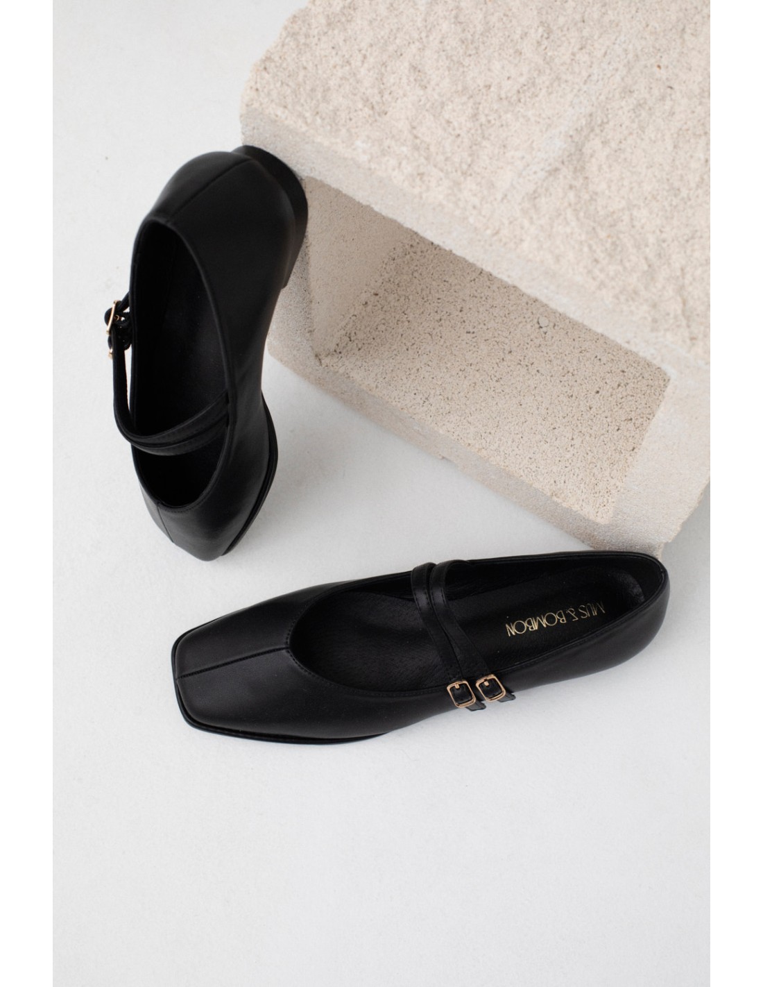 Ballerines avec deux lanières et boucles dorées, bout carré et détails de surpiqûres simples. Semelle en caoutchouc et petit talon. Idéales pour toutes les occasions.