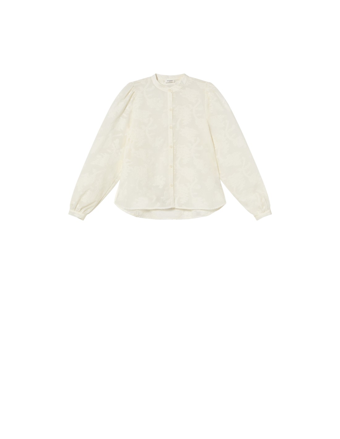 Blouse en jacquard avec col mao, bas arrondis et manches larges bouffantes. Parfaite pour un look élégant, elle se distingue par sa touche romantique.