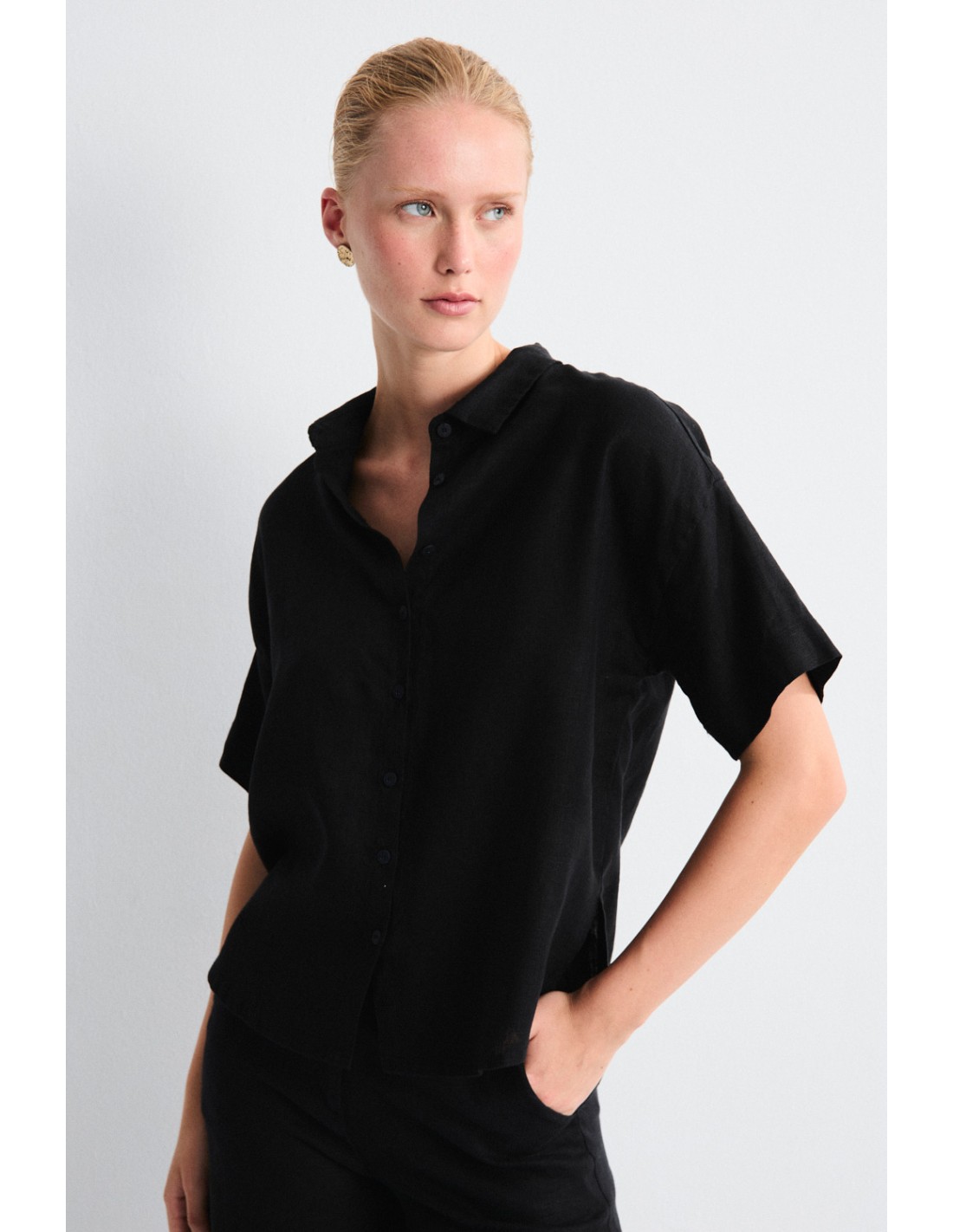 Chemise en lin à col chemise, manches courtes et fermeture boutonnée sur le devant, avec une silhouette décontractée et une essence intemporelle. Associez-la à un pantalon Bobby et vous obtiendrez un look complet.