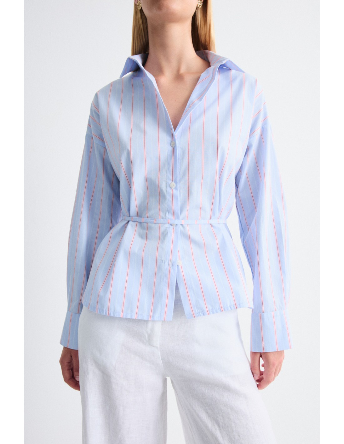 Chemise à rayures oversize avec ourlets arrondis, manches longues et détail de sangle au dos avec passants de ceinture, ce qui permet d'ajuster la taille ou de la porter comme une ceinture. Associez-la au short Icaro pour un look total et moderne.