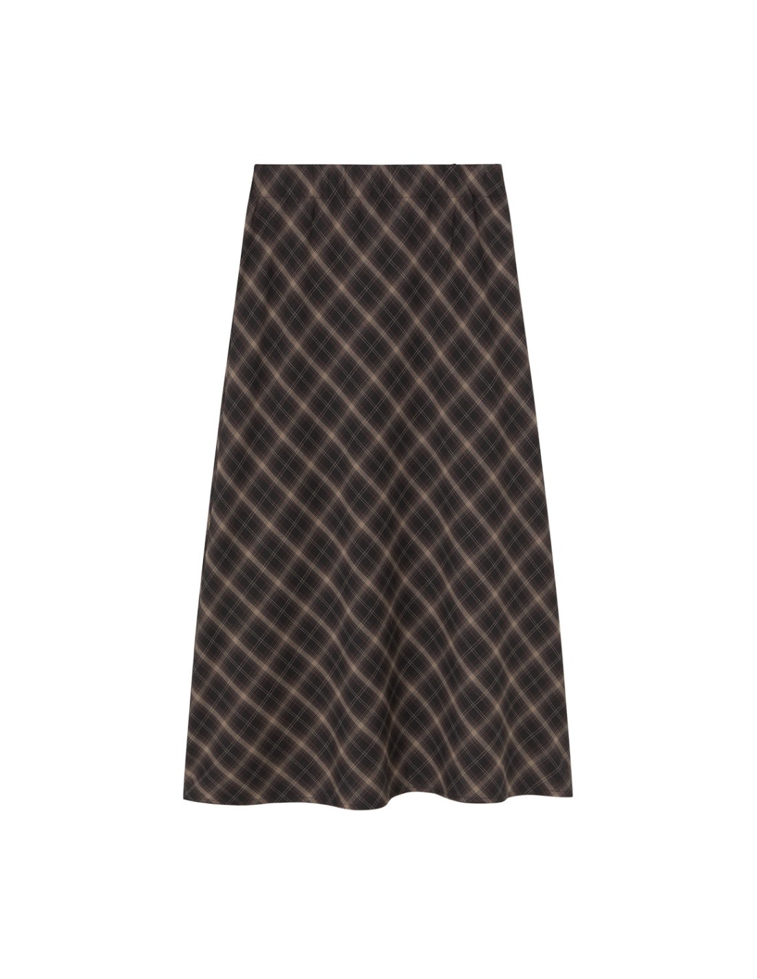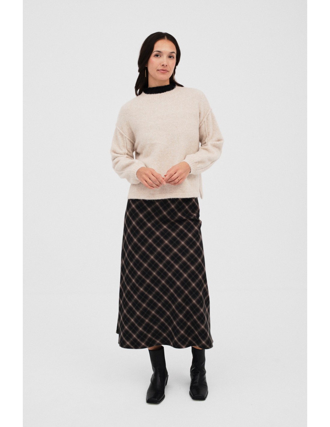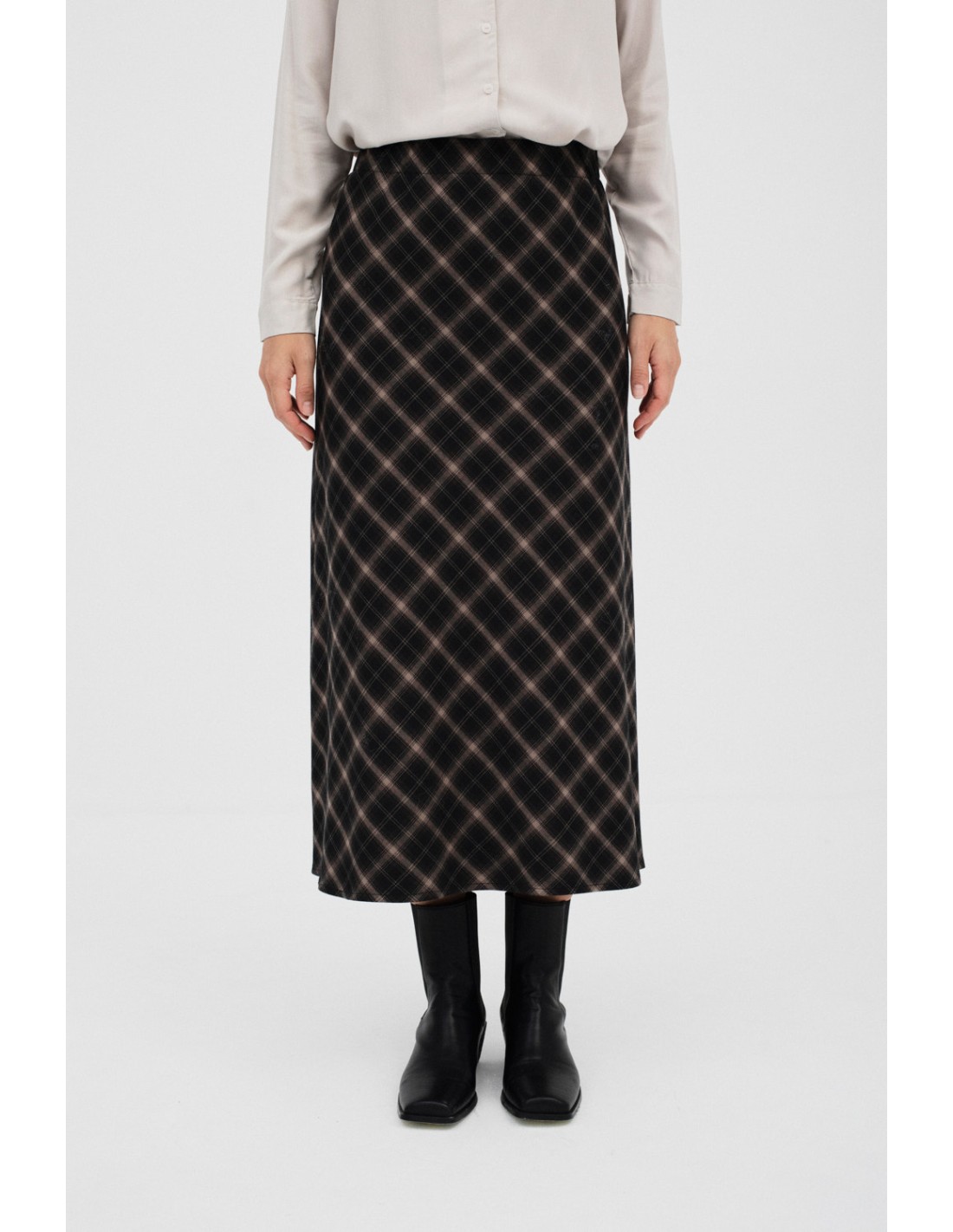Downtown est une jupe midi en biais avec un élégant design à carreaux. Elle se ferme avec une fermeture éclair invisible et possède un élastique plat à l'arrière, parfaite pour un look polyvalent et sophistiqué.