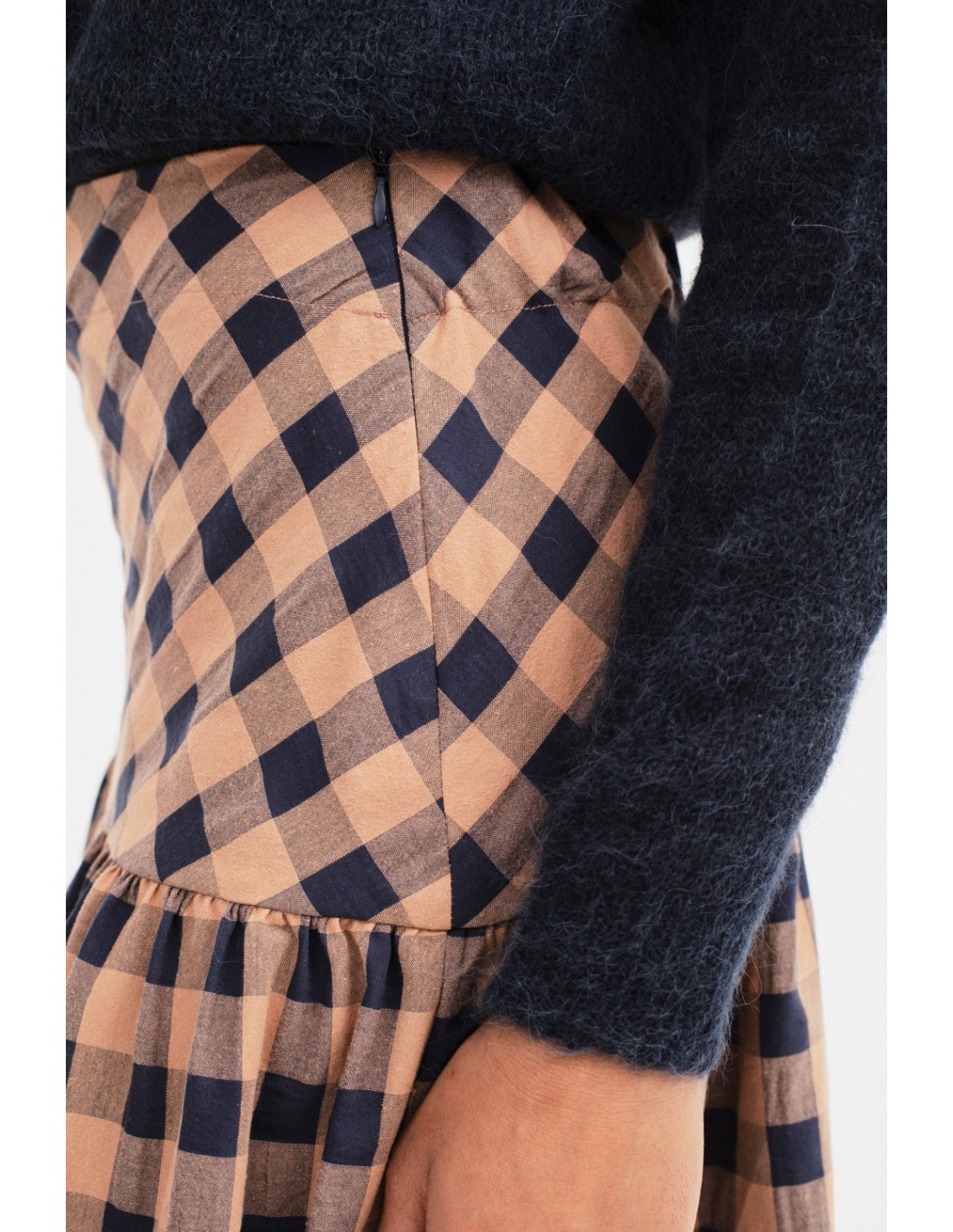Jupe longue vichy avec canezou ajusté et ampleur à partir de la hanche, fermeture à fermeture éclair invisible sur le côté et élastique plat à l'arrière. Associez-la à la blouse Marlene et au sac Whitehall.