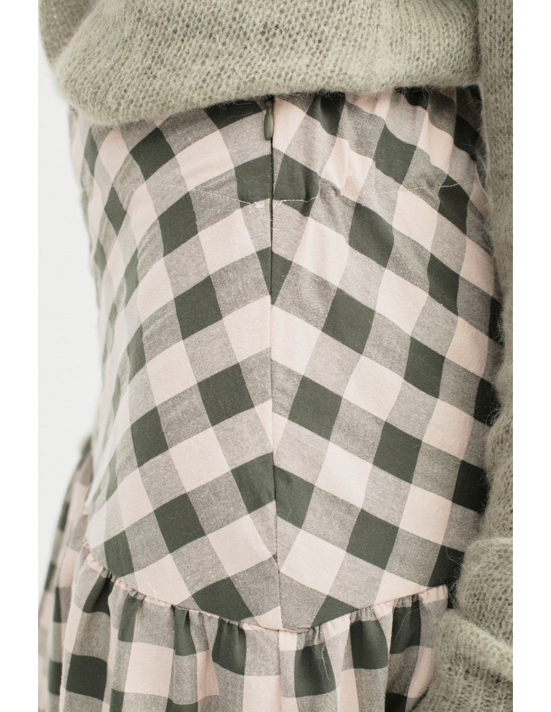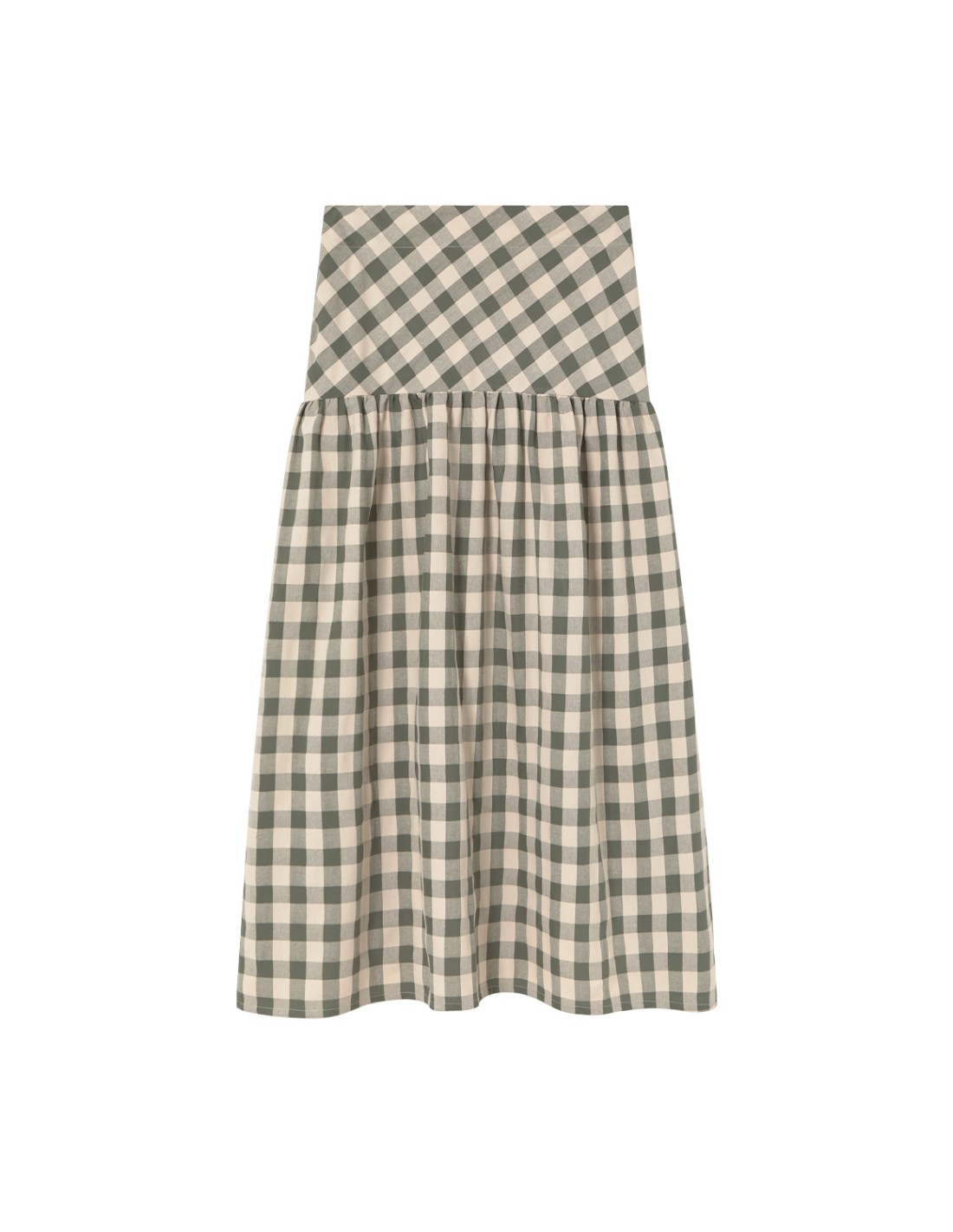 Jupe longue vichy avec canezou ajusté et ampleur à partir de la hanche, fermeture à fermeture éclair invisible sur le côté et élastique plat à l'arrière. Associez-la à la blouse Marlene et au sac Whitehall.