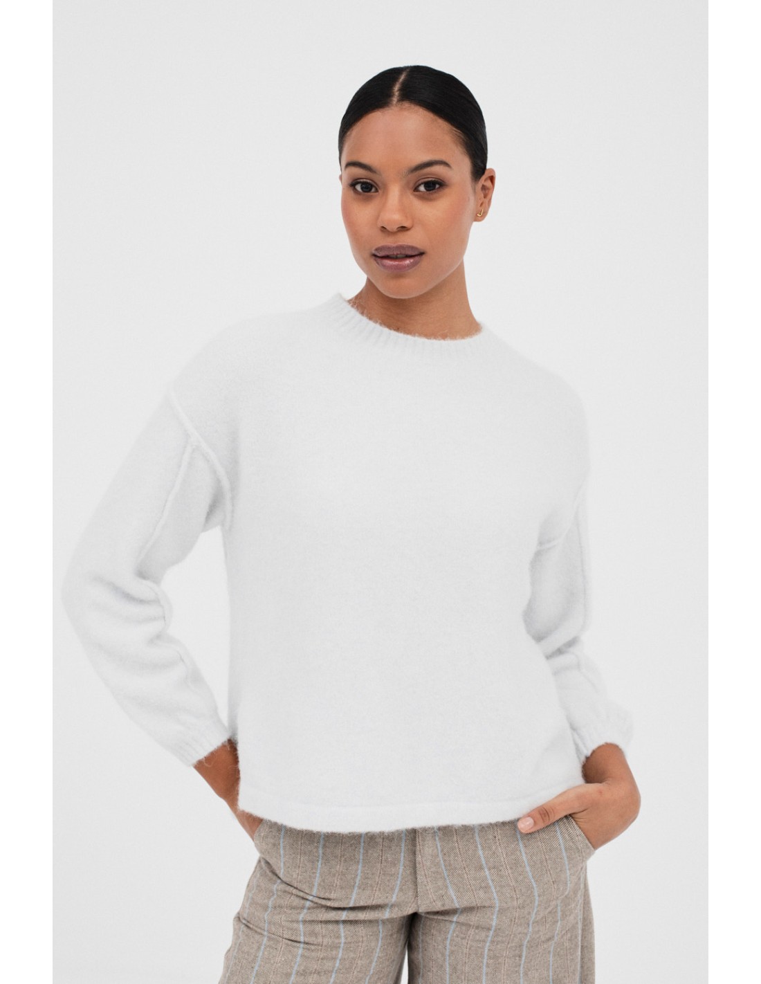Pull à manches longues avec un col haut ajouté. Il présente un détail de coutures extérieures et des finitions en côtes, lui apportant un style moderne et élégant.