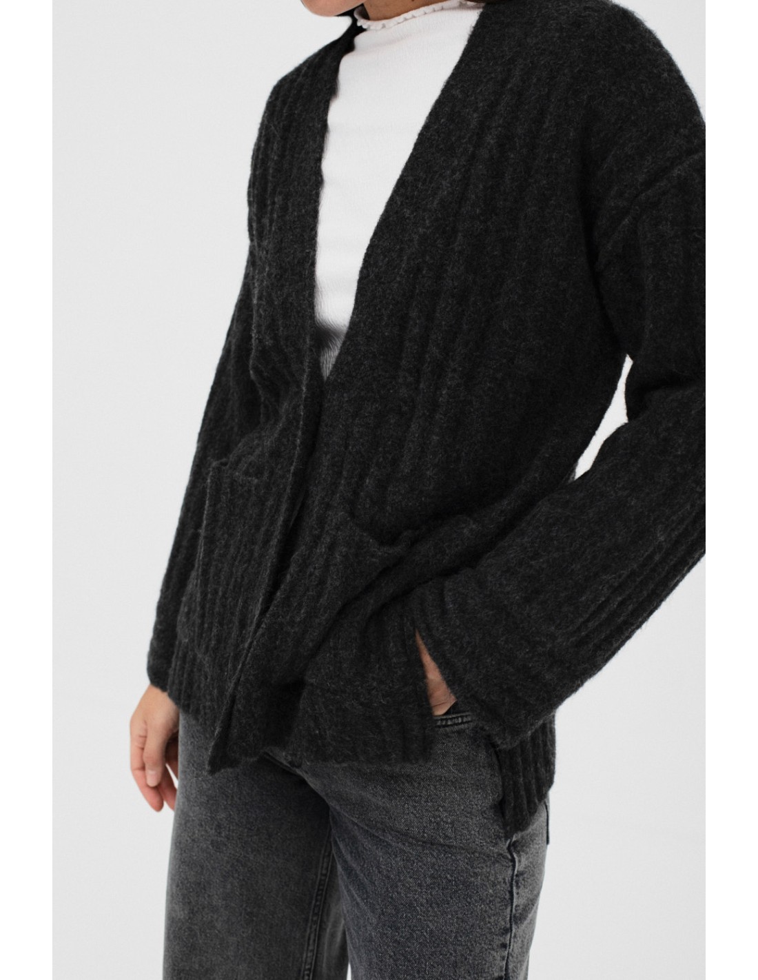 Cardigan en tricot côtelé avec des poignets en côtes horizontales repliés vers l'extérieur. Ouverture frontale avec boutons et fentes sur les côtés. Il dispose de deux poches avant. Se combine avec les accessoires Bukon et Busan.