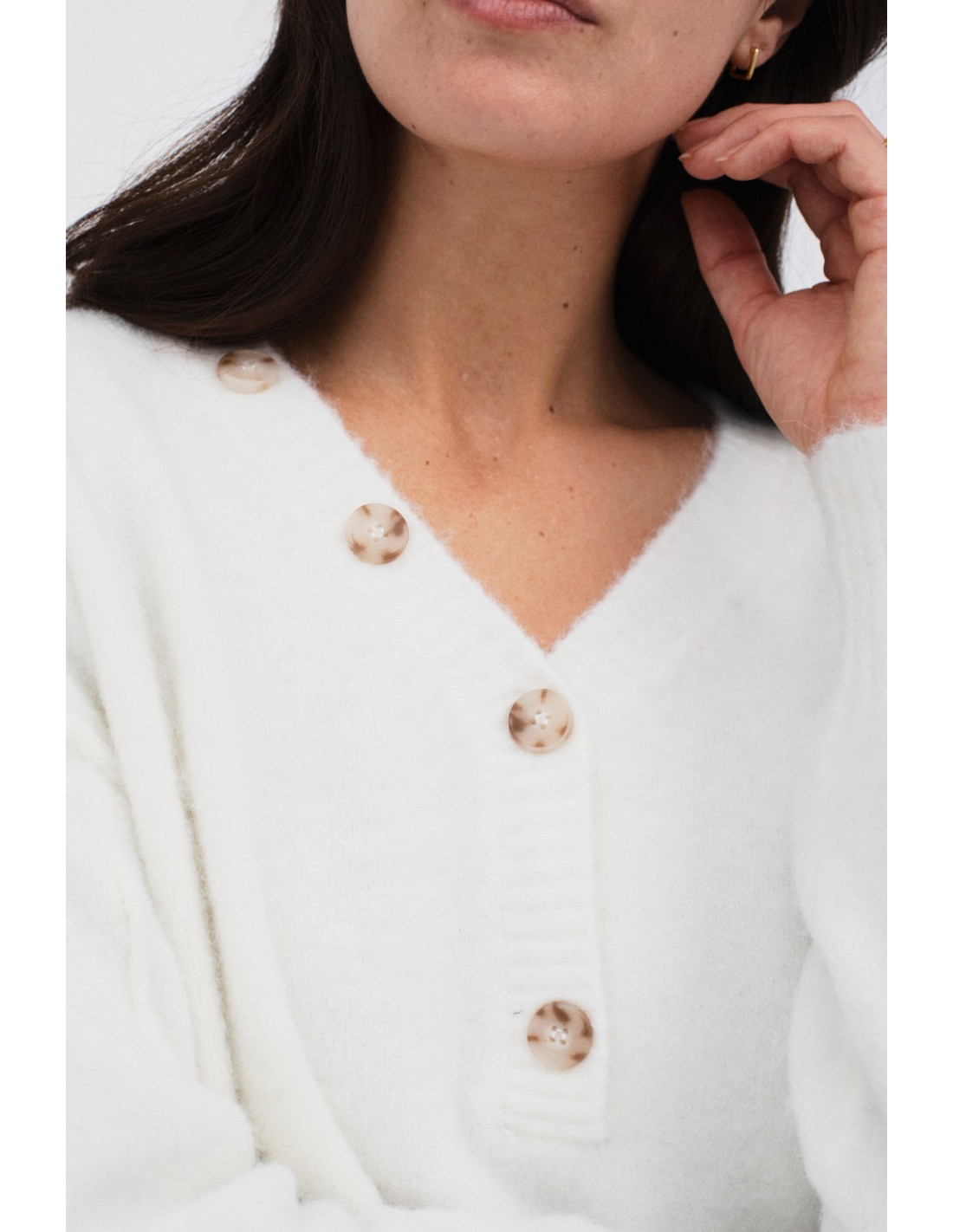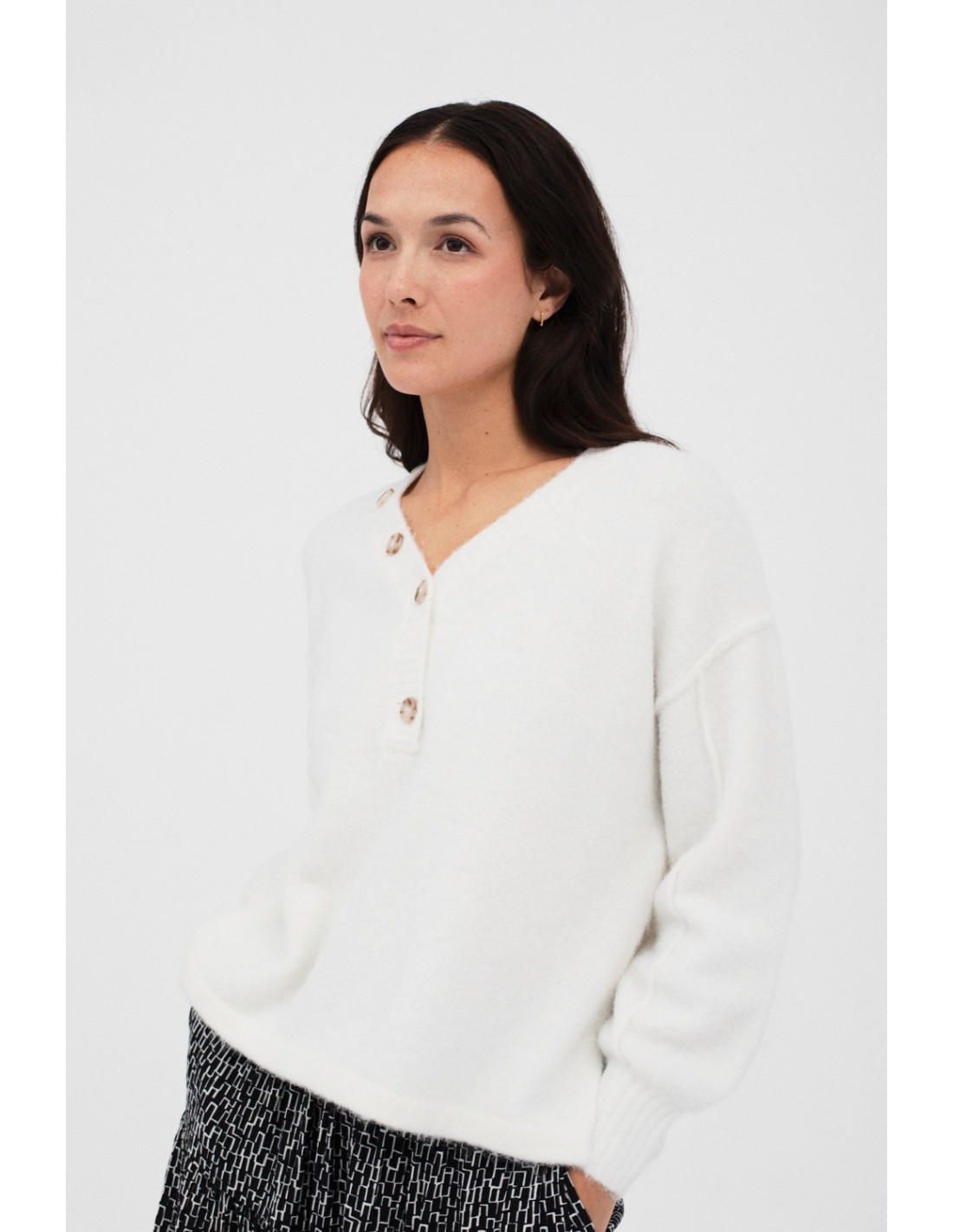 Pull à col en V avec une fausse ouverture à boutons et des poignets en côtes, lui donnant une touche unique et polyvalente.