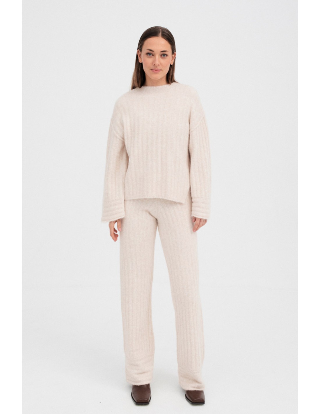 Pantalons en tricot côtelé, avec taille élastique pour un ajustement parfait. L'ourlet présente un élégant détail de côtes horizontales, ajoutant une touche moderne et élégante. Se combine parfaitement avec le pull Song et le cardigan Gangam pour un look complet.