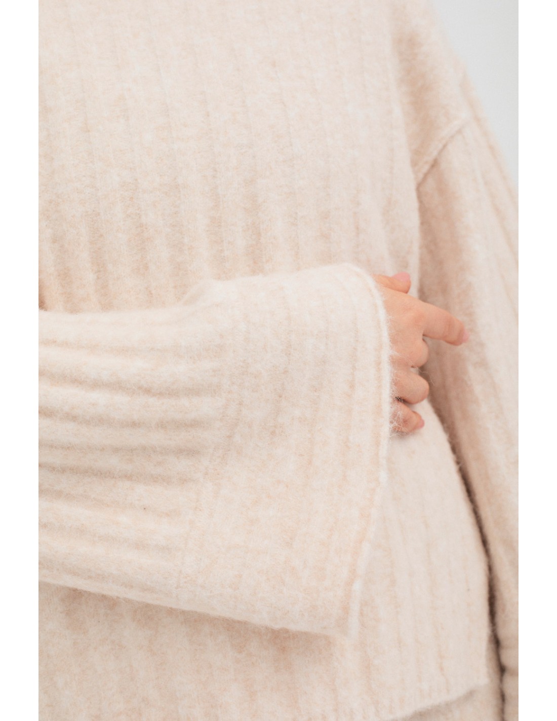 Pull à manches longues avec un élégant col haut en côte. Le corps et les manches présentent des détails de côtes horizontales au niveau des poignets. L'ourlet est également fini en côte, avec une ouverture diagonale sur le côté gauche. Se combine parfaitement avec le pantalon Nowon.