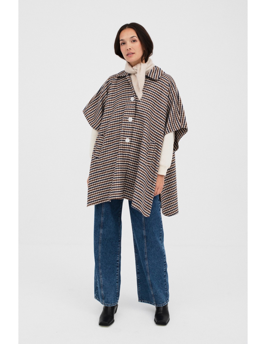 Manteau type cape au design élégant et fonctionnel. Il présente des côtés arrondis et ouverts avec des boutons, ainsi qu'un boutonnage frontal et des poches pratiques.