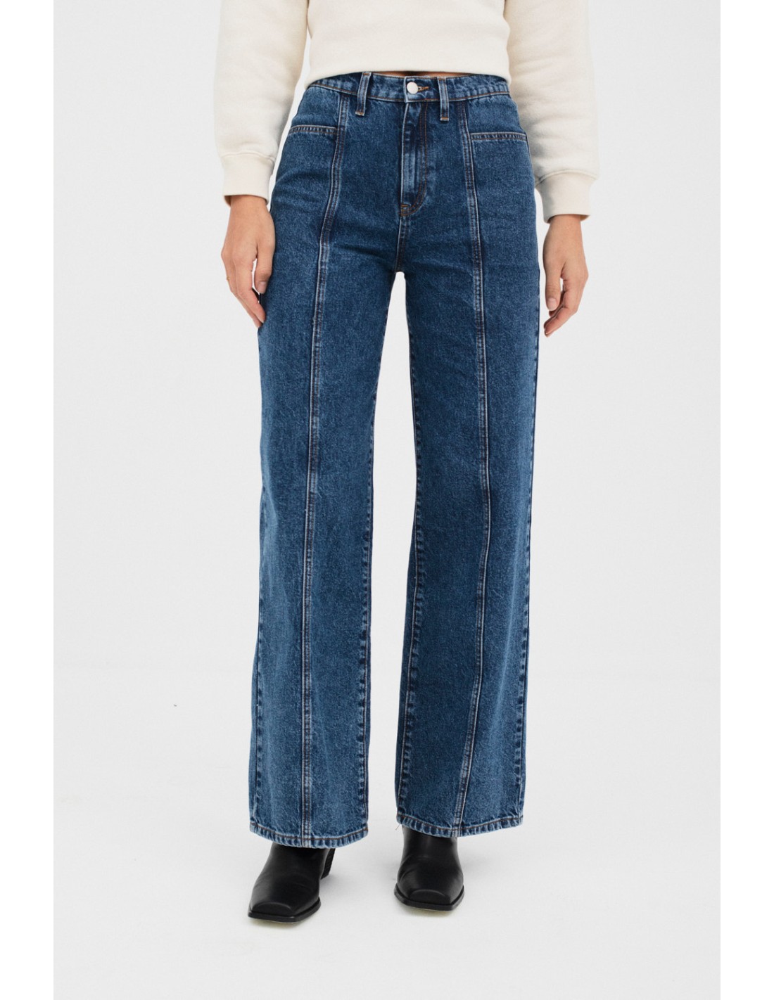 Jean à taille haute et coupe large, avec des coutures centrales qui apportent un ajustement élégant et moderne.