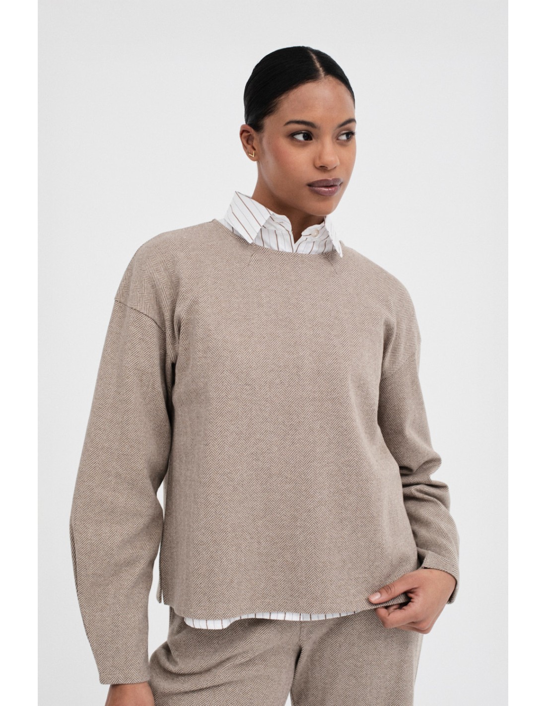 Le sweat-shirt en jacquard à chevrons Katong présente un design moderne avec un col rond, des manches bouffantes et des plis délicats. Associez-le au pantalon Koreg.