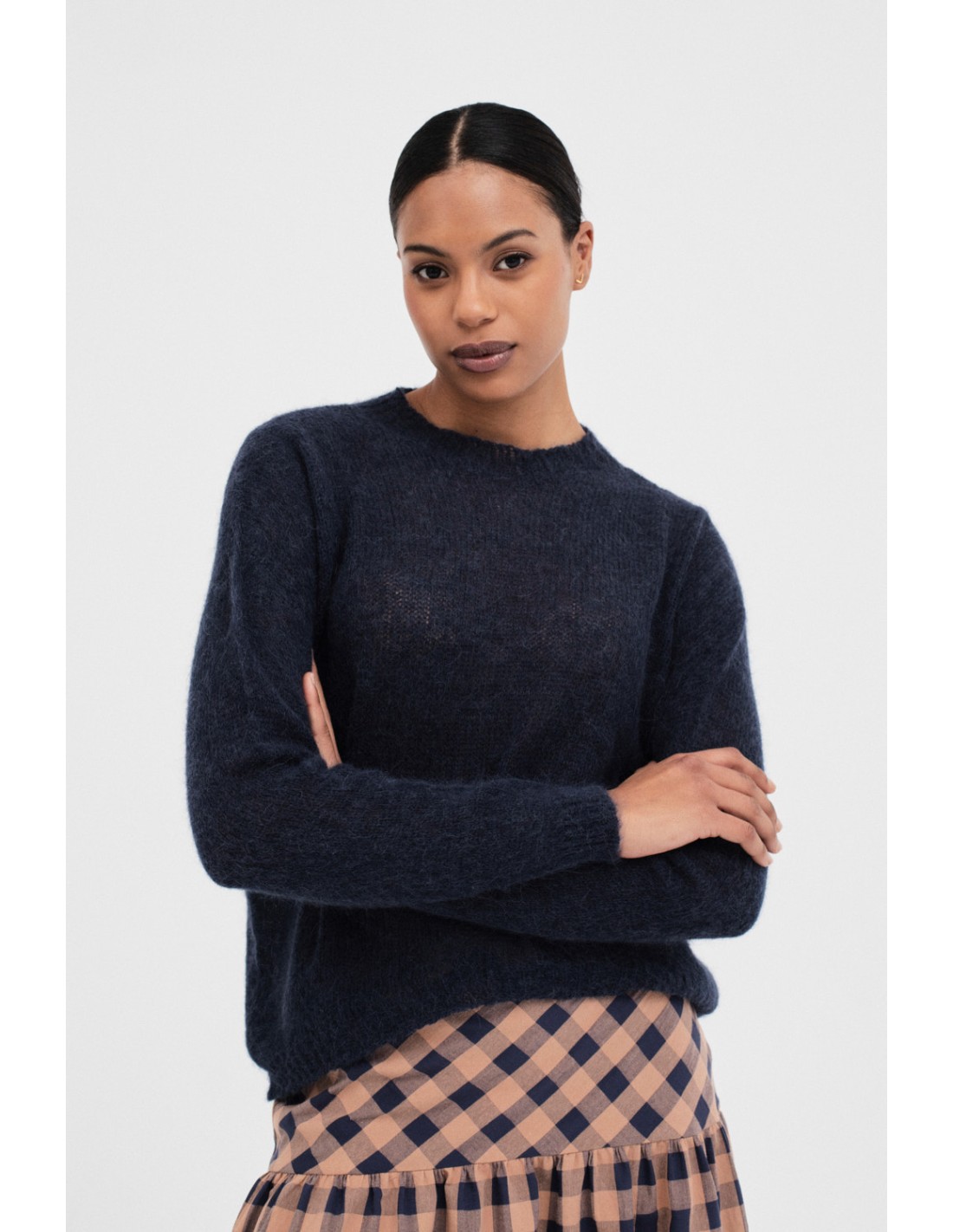 Un pull en tricot lisse avec col rond et manches longues. Il est tricoté intégralement, avec des finitions en bord-côte, un bas arrondi et un design légèrement plus court à l'avant.