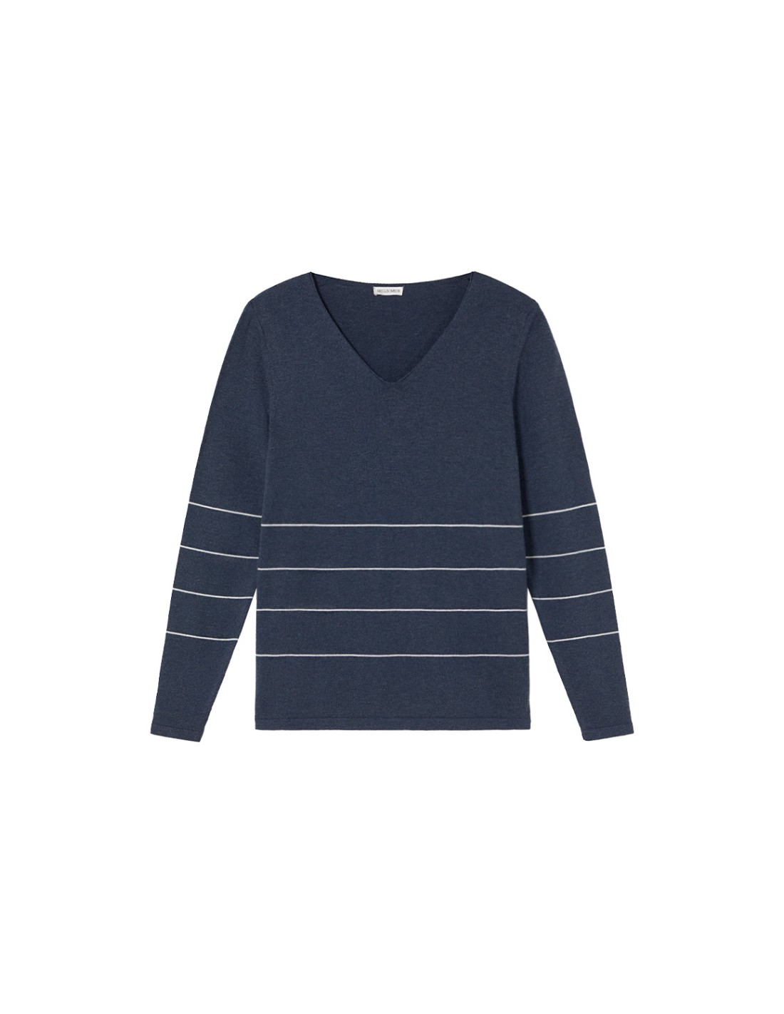 Pull en maille fine à col en V et rayures contrastées qui apportent une touche délicate. Son tissu doux et son tombé léger le rendent parfait à porter seul ou associé à la jupe Esterope.
