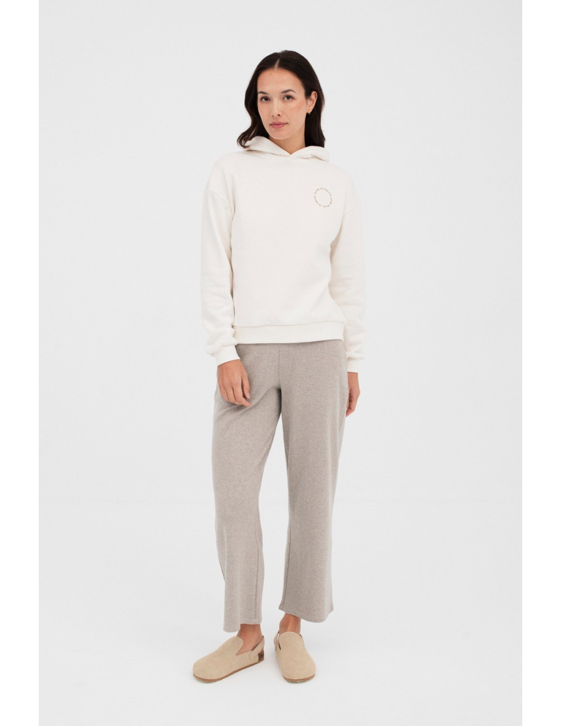 Sweat-shirt molletonné avec capuche, finitions en bord-côte aux poignets et à l'ourlet, et imprimés textuels en forme circulaire : grand dans le dos et petit sur la poitrine.