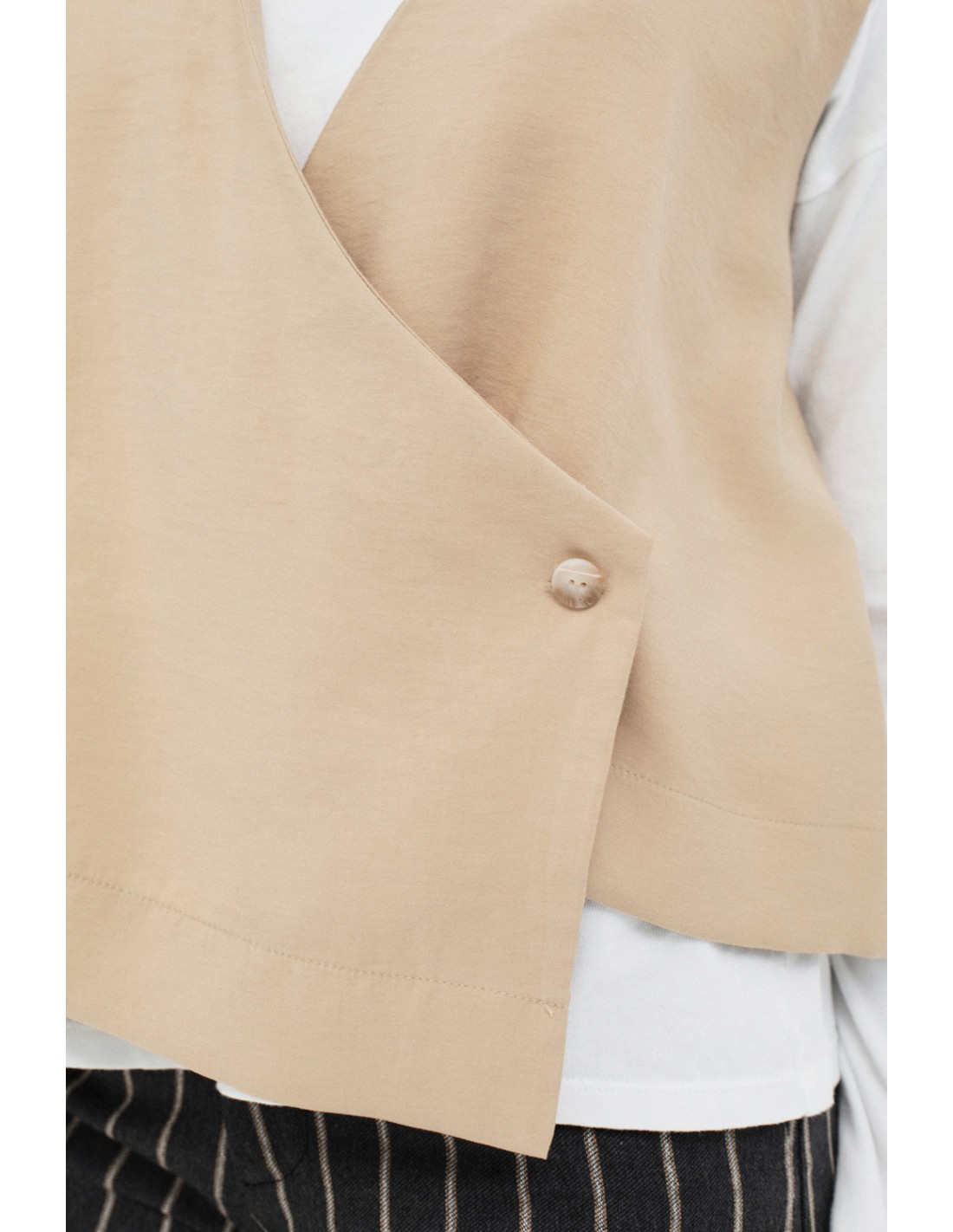 Gilet court avec fermeture latérale par bouton, décolleté en V et fausse poche sur le côté droit. Le côté droit se superpose au côté gauche et est légèrement plus long. À associer avec le pantalon Billwerder pour un total look.