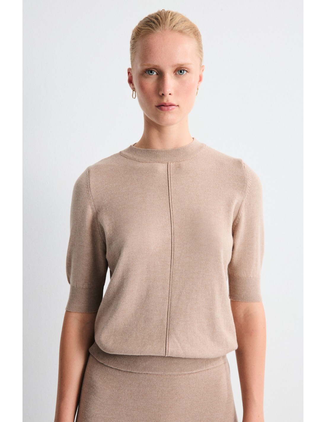 Pull en maille douce à manches courtes et encolure ronde. Détail de couture centrale qui apporte une touche minimaliste et élégante. À associer avec la jupe Esterope pour un total look.