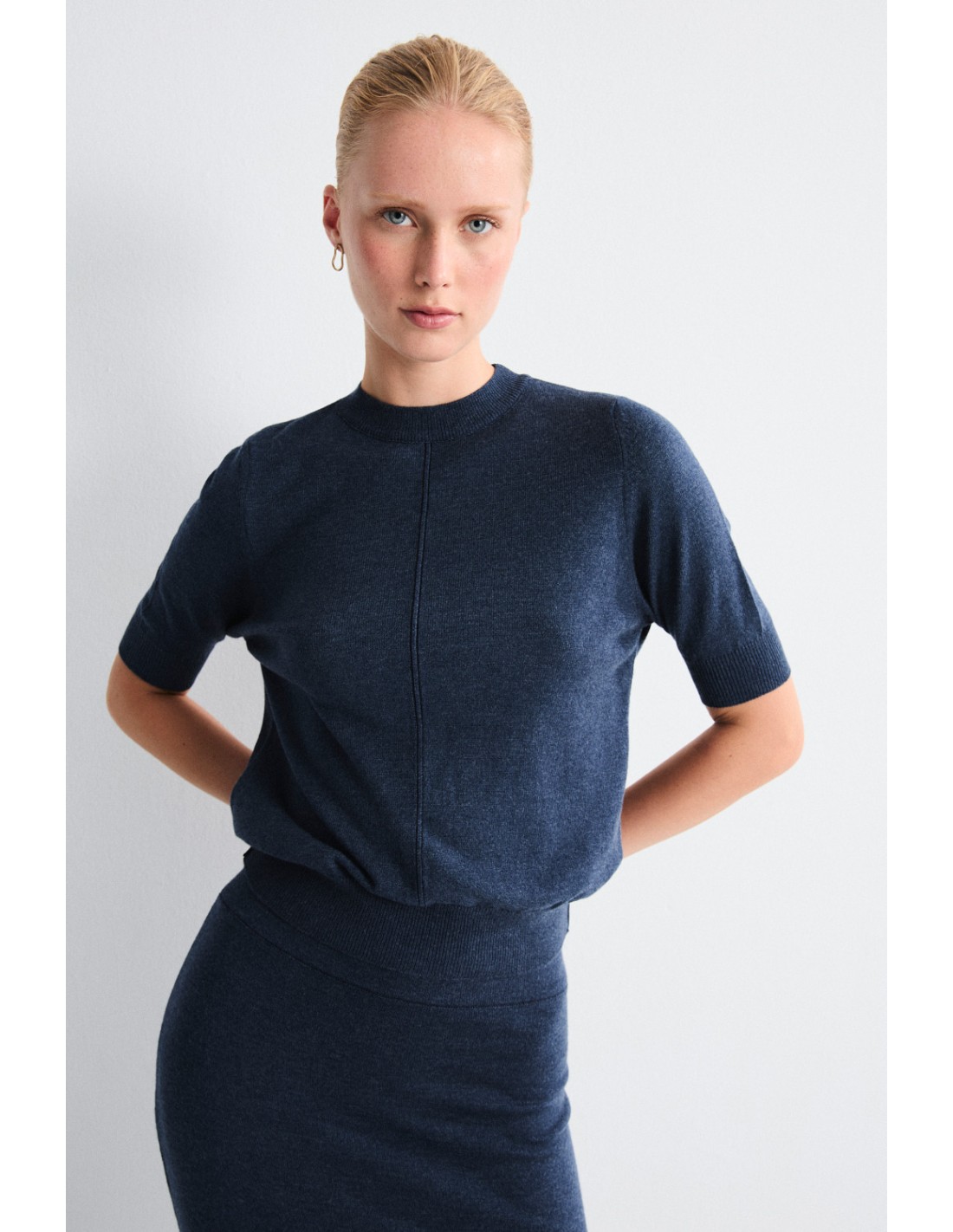 Pull en maille douce à manches courtes et encolure ronde. Détail de couture centrale qui apporte une touche minimaliste et élégante. À associer avec la jupe Esterope pour un total look.