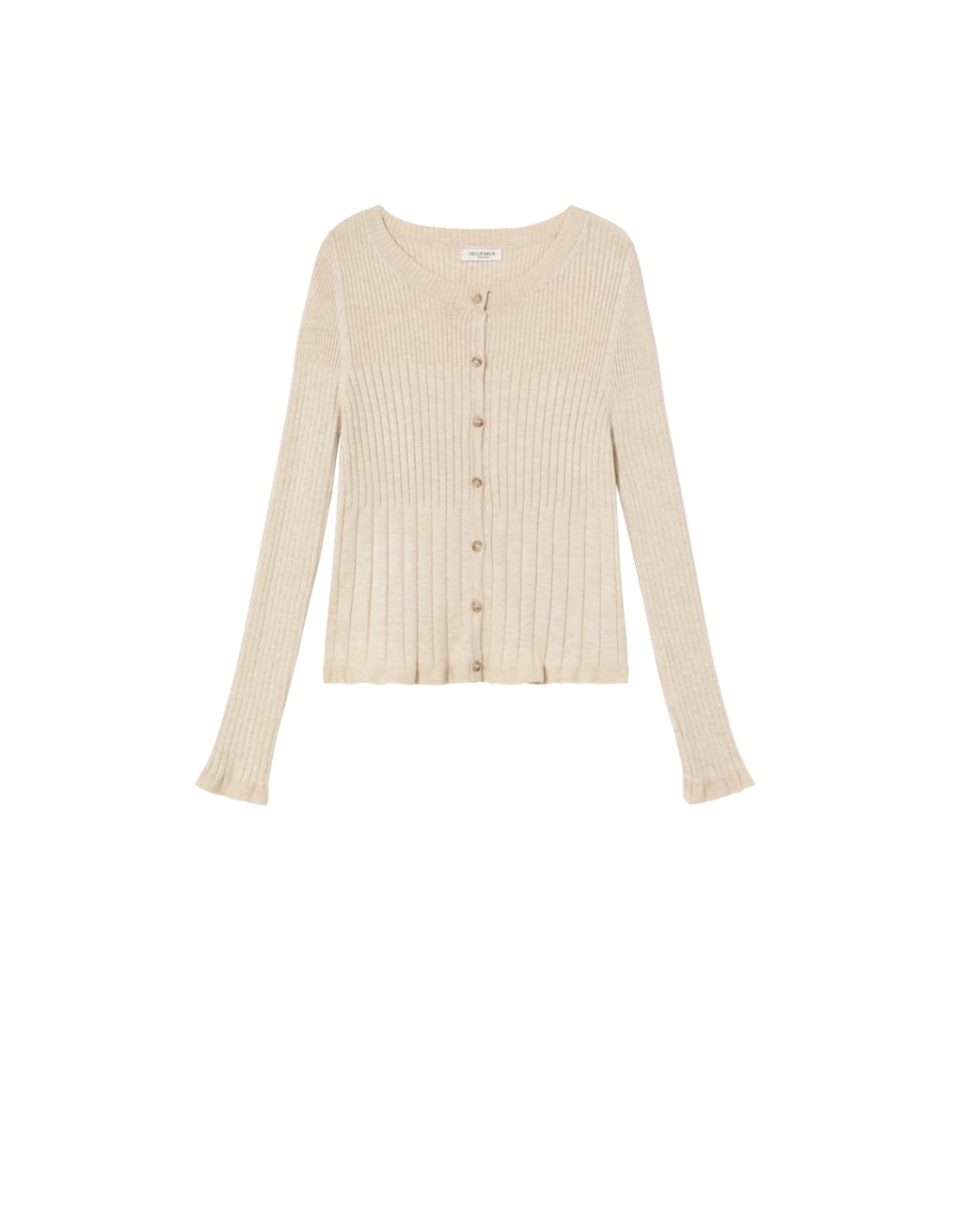 Cardigan à manches longues et coupe droite, avec un design unique qui combine trois types différents de côtes sur le corps et deux sur les manches. Il a un col rond et une ouverture avec des boutons à l'avant. Les poignets présentent un détail de trois boutons. Se combine parfaitement avec le top Seef pour un look en deux pièces.