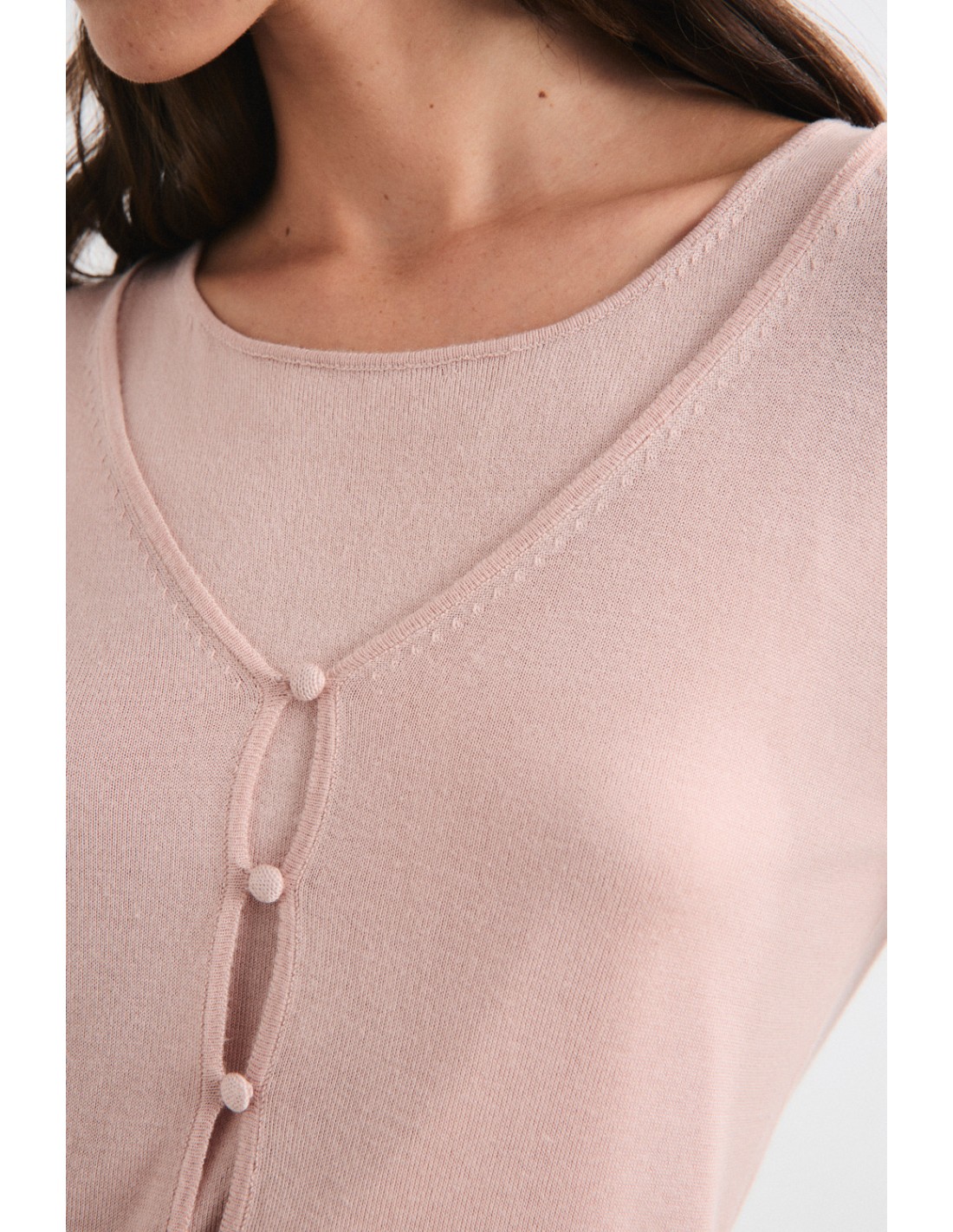 Cardigan court à manches longues et encolure en V, avec boutons doublés pour une finition délicate. Il fait partie de la famille Yakira, douce et polyvalente, tout comme le pull et le top dans le même fil.