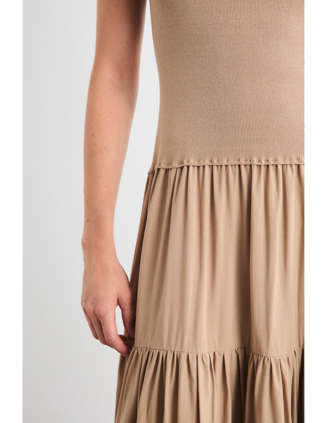 Robe sans manches en bi-matière, avec corps en tricot et jupe en tissu léger. Décolleté en mini V et bas à volants pour plus de mouvement. A combiner avec la cape Roshan pour un look sophistiqué.