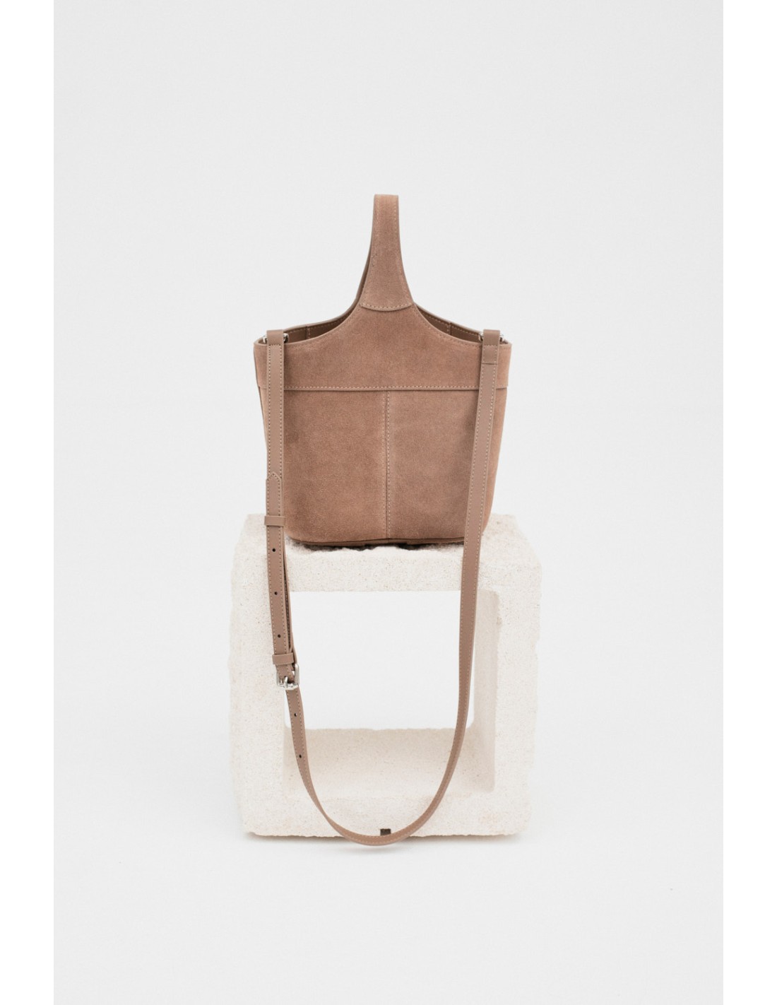Sac en daim avec une anse courte et une anse longue ajustable. À l'intérieur, il y a une poche avec un passepoil en cuir et un sac en coton froncé avec cordon. Le logo de Mus&Bombon est gravé à l'intérieur.