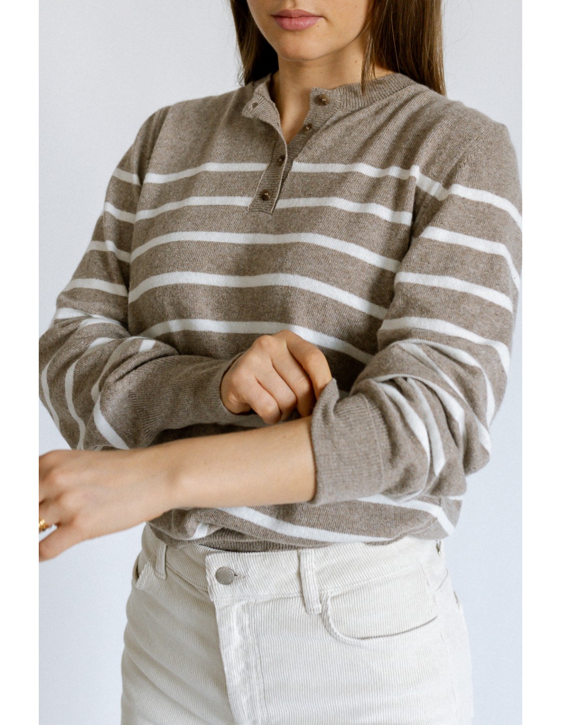 Pull à manches longues avec col rond et patte de boutonnage côtelée ; poignets et ourlet côtelés 2x1. Corps en jersey simple avec rayures contrastées; manches rentrées.