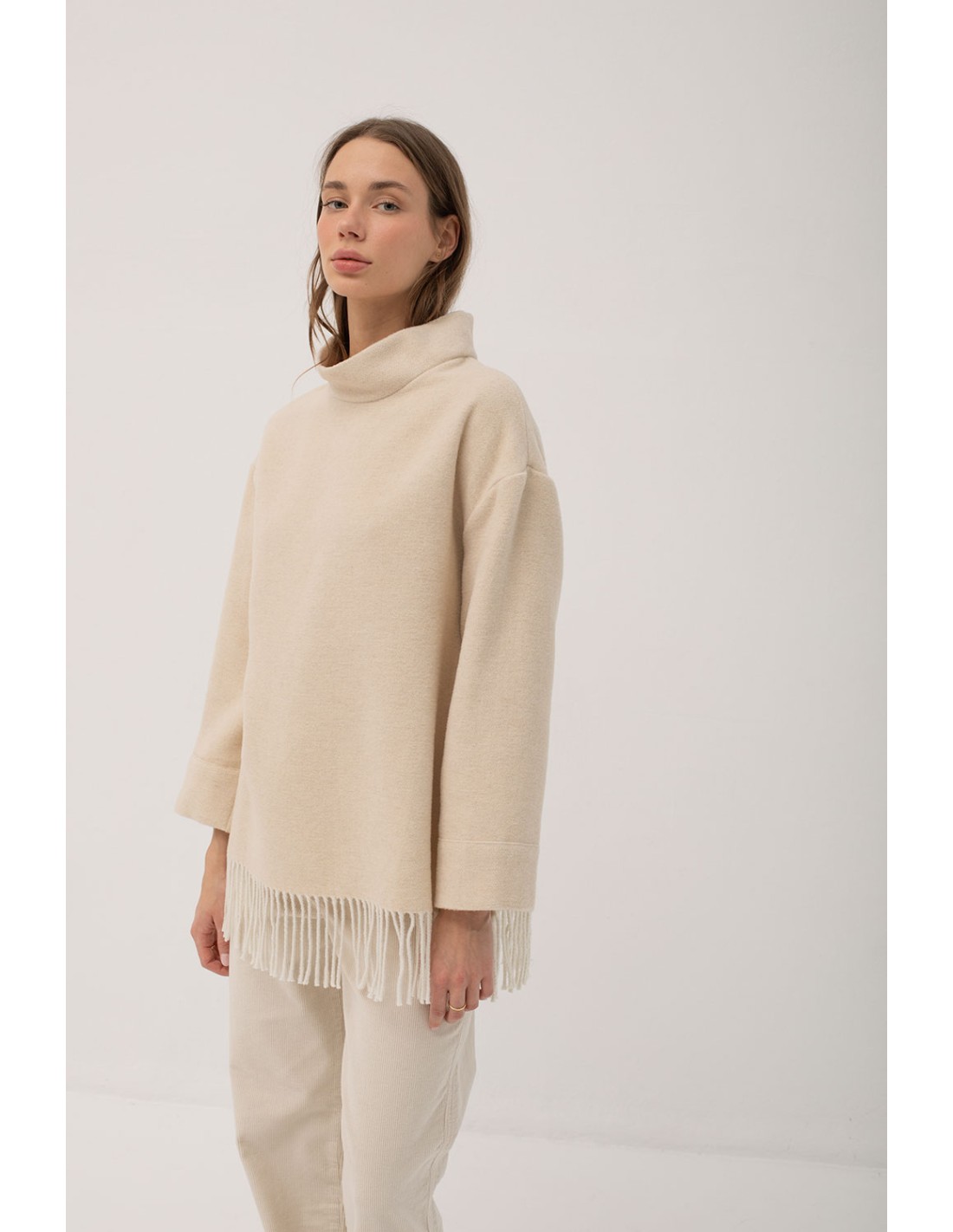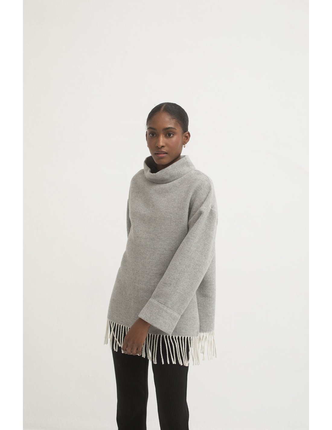 Le pull Caima est un pull à col bénitier qui présente de grandes fentes latérales et des franges à l''ourlet, offrant un design distinctif et moderne. Si vous aimez les franges, ne manquez pas le manteau Cluta et l''écharpe Cable.